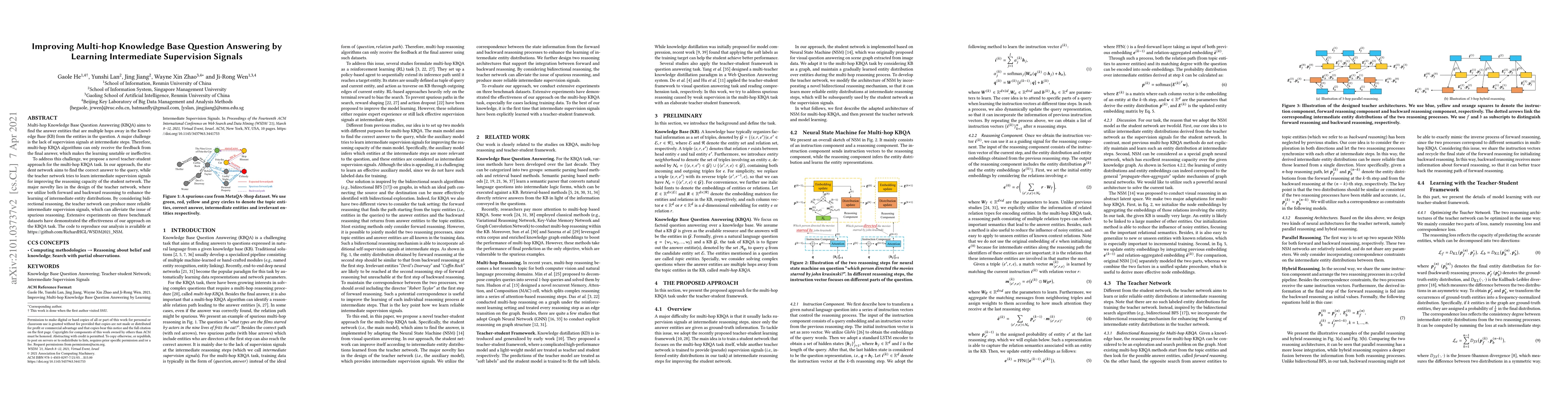This paper proposes a teacher-student framework to improve multi-hop KBQA by generating intermediate supervision signals through bidirectional reasoning. The teacher network enhances the student network's reasoning capacity, leading to better performance on benchmark datasets.