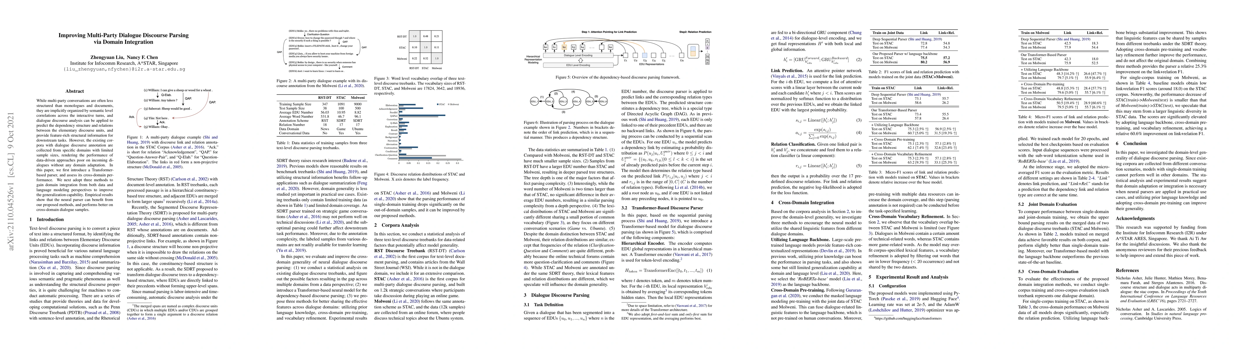 This paper proposes a Transformer-based parser for multi-party dialogue discourse parsing and introduces methods to enhance its cross-domain performance through domain integration. Empirical results demonstrate improved generalization and better performance on dialogues from different domains.