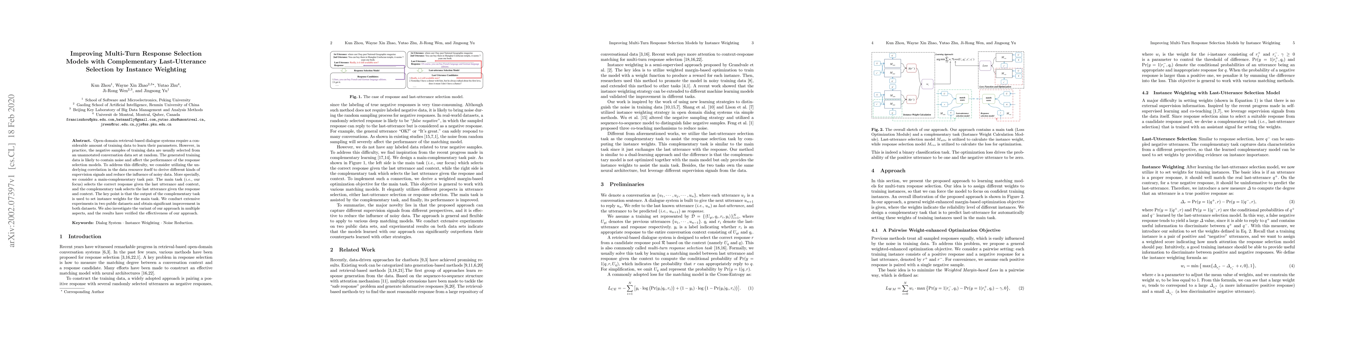 This paper proposes a method to improve multi-turn response selection models by using complementary last-utterance selection with instance weighting to reduce noise from training data. The approach shows significant performance gains in two public datasets and demonstrates the effectiveness of the proposed technique.
