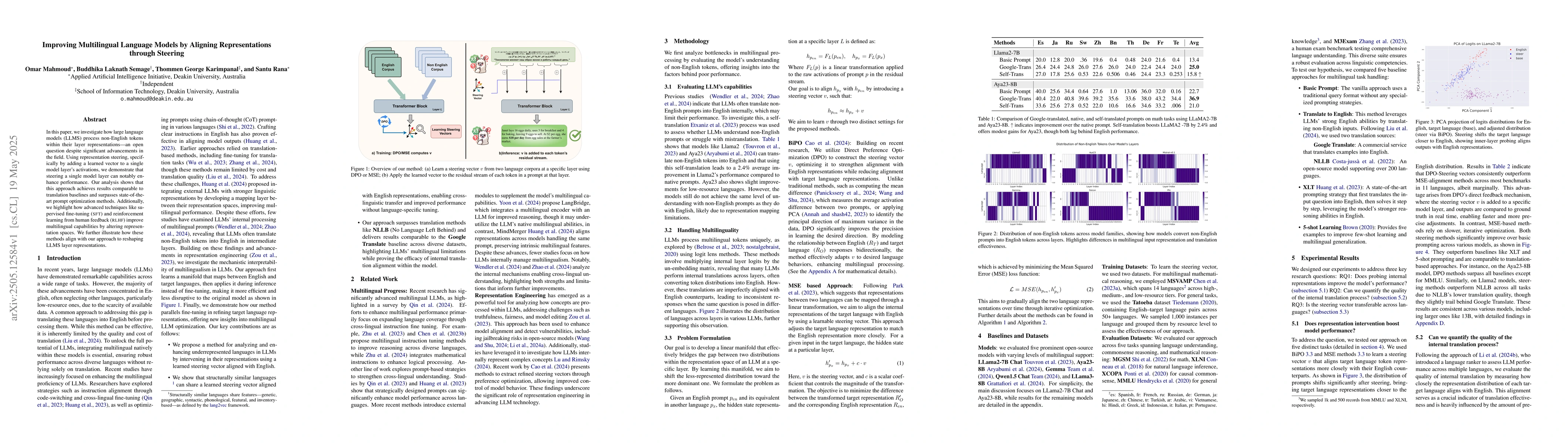 In this paper, we investigate how large language models (LLMS) process non-English tokens within their layer representations, an open question despite significant advancements in the field. Using representation steering, specifically by adding a learned vector to a single model layer's activations, we demonstrate that steering a single model layer can notably enhance performance. Our analysis shows that this approach achieves results comparable to translation baselines and surpasses state of the art prompt optimization methods. Additionally, we highlight how advanced techniques like supervised fine tuning (\textsc{sft}) and reinforcement learning from human feedback (\textsc{rlhf}) improve multilingual capabilities by altering representation spaces. We further illustrate how these methods align with our approach to reshaping LLMS layer representations.