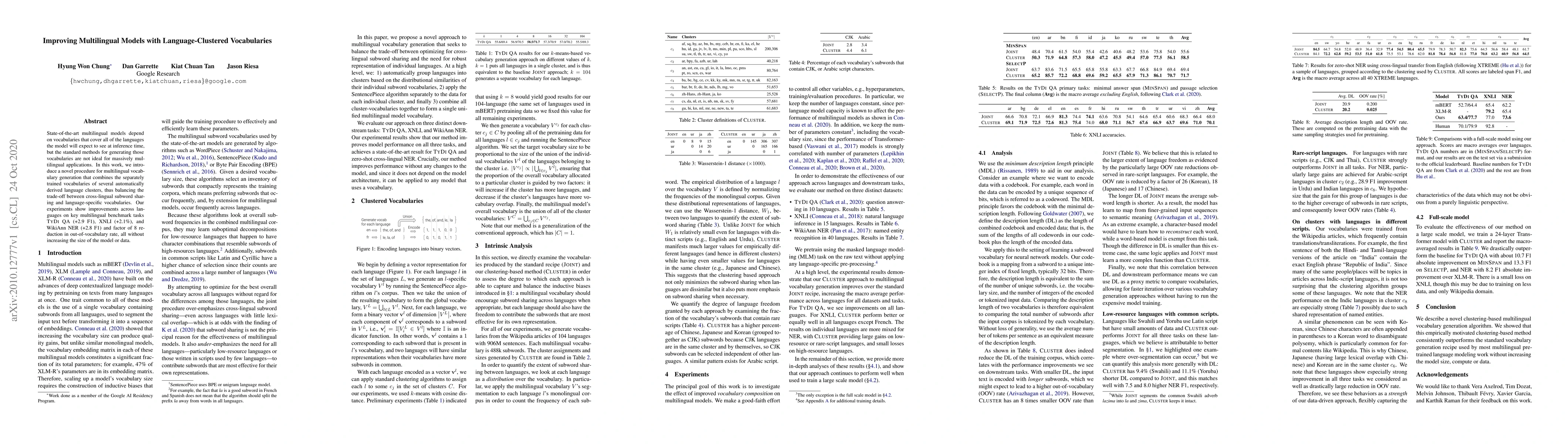 This paper proposes a new vocabulary generation method for multilingual models by clustering languages and using language-specific vocabularies, achieving better performance on benchmarks and reducing out-of-vocabulary errors without increasing model size or data.