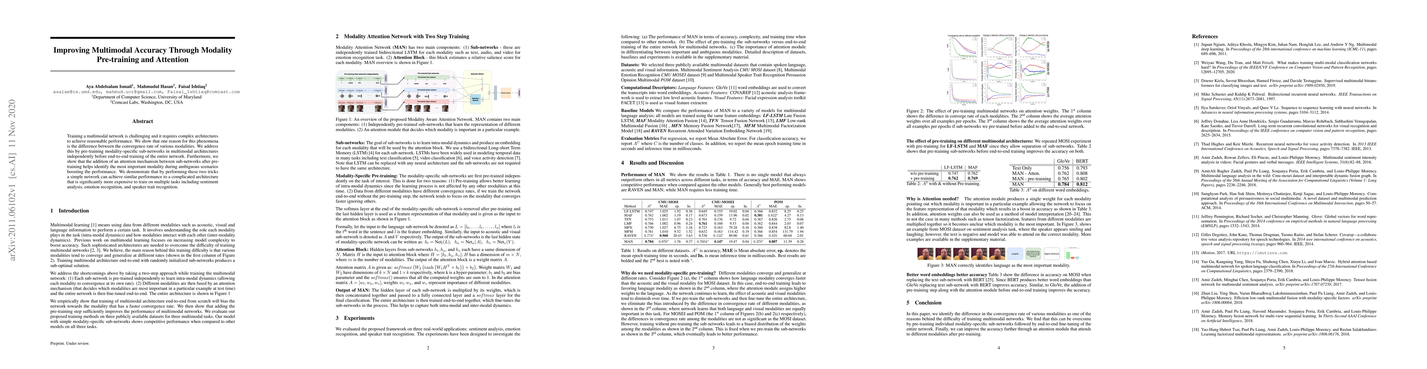 This paper proposes pre-training modality-specific sub-networks separately before joint training and incorporating an attention mechanism to enhance multimodal network performance. These techniques enable simpler networks to achieve comparable results to more complex, costly architectures in tasks like sentiment analysis and emotion recognition.
