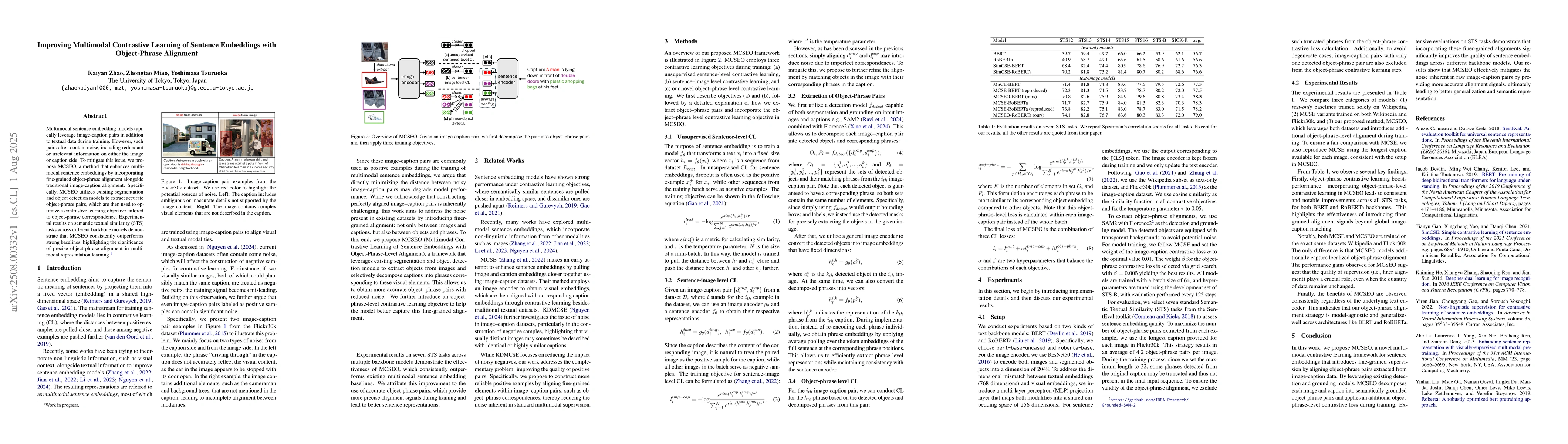 Multimodal sentence embedding models typically leverage image-caption pairs in addition to textual data during training. However, such pairs often contain noise, including redundant or irrelevant information on either the image or caption side. To mitigate this issue, we propose MCSEO, a method that enhances multimodal sentence embeddings by incorporating fine-grained object-phrase alignment alongside traditional image-caption alignment. Specifically, MCSEO utilizes existing segmentation and object detection models to extract accurate object-phrase pairs, which are then used to optimize a contrastive learning objective tailored to object-phrase correspondence. Experimental results on semantic textual similarity (STS) tasks across different backbone models demonstrate that MCSEO consistently outperforms strong baselines, highlighting the significance of precise object-phrase alignment in multimodal representation learning.