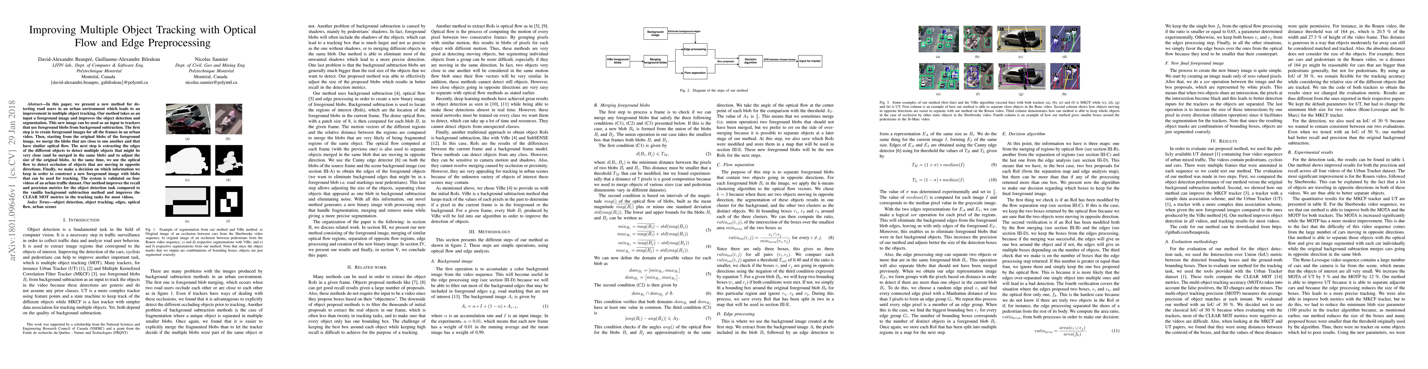This paper introduces a new method for enhancing multiple object tracking in urban environments by merging foreground blobs based on optical flow and refining object detection through edge extraction. The proposed approach improves recall and precision in object detection and enhances tracking metrics compared to traditional background subtraction methods.