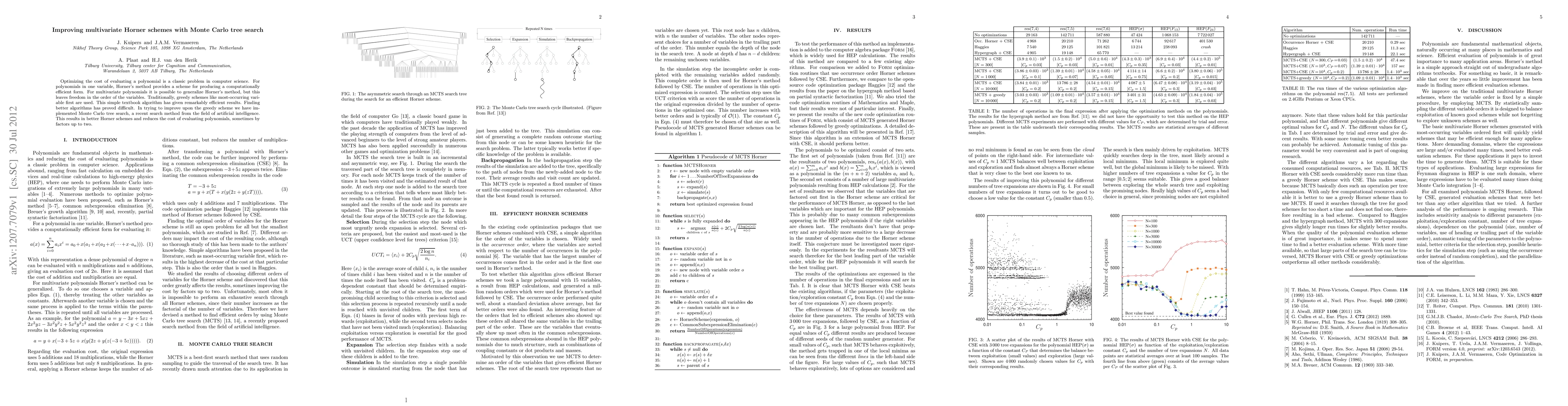 Optimizing the cost of evaluating a polynomial is a classic problem in computer science. For polynomials in one variable, Horner's method provides a scheme for producing a computationally efficient form. For multivariate polynomials it is possible to generalize Horner's method, but this leaves freedom in the order of the variables. Traditionally, greedy schemes like most-occurring variable first are used. This simple textbook algorithm has given remarkably efficient results. Finding better algorithms has proved difficult. In trying to improve upon the greedy scheme we have implemented Monte Carlo tree search, a recent search method from the field of artificial intelligence. This results in better Horner schemes and reduces the cost of evaluating polynomials, sometimes by factors up to two.
