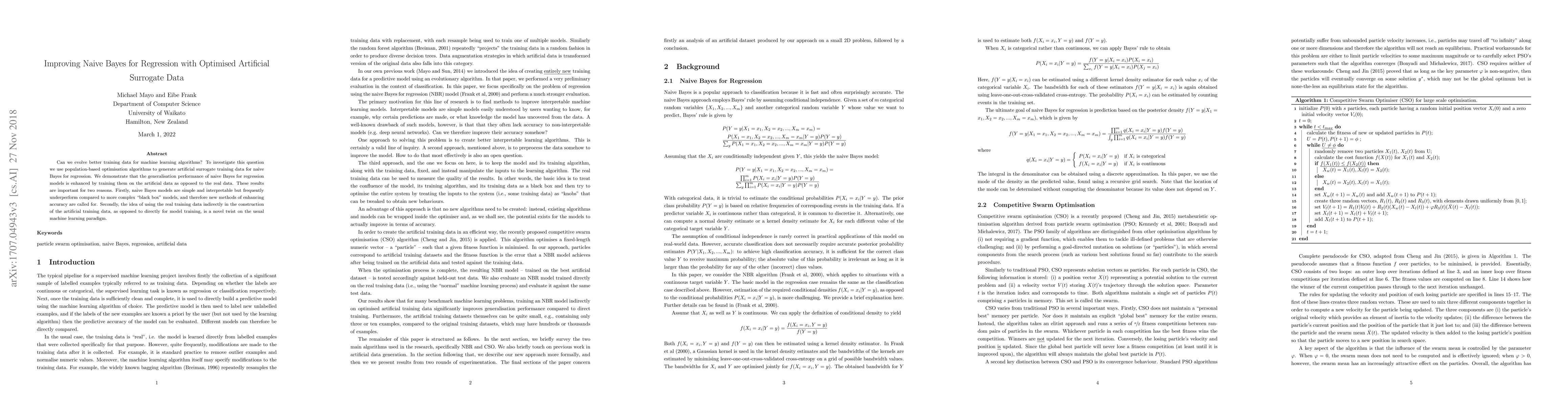Can we evolve better training data for machine learning algorithms? To investigate this question we use population-based optimisation algorithms to generate artificial surrogate training data for naive Bayes for regression. We demonstrate that the generalisation performance of naive Bayes for regression models is enhanced by training them on the artificial data as opposed to the real data. These results are important for two reasons. Firstly, naive Bayes models are simple and interpretable but frequently underperform compared to more complex "black box" models, and therefore new methods of enhancing accuracy are called for. Secondly, the idea of using the real training data indirectly in the construction of the artificial training data, as opposed to directly for model training, is a novel twist on the usual machine learning paradigm.