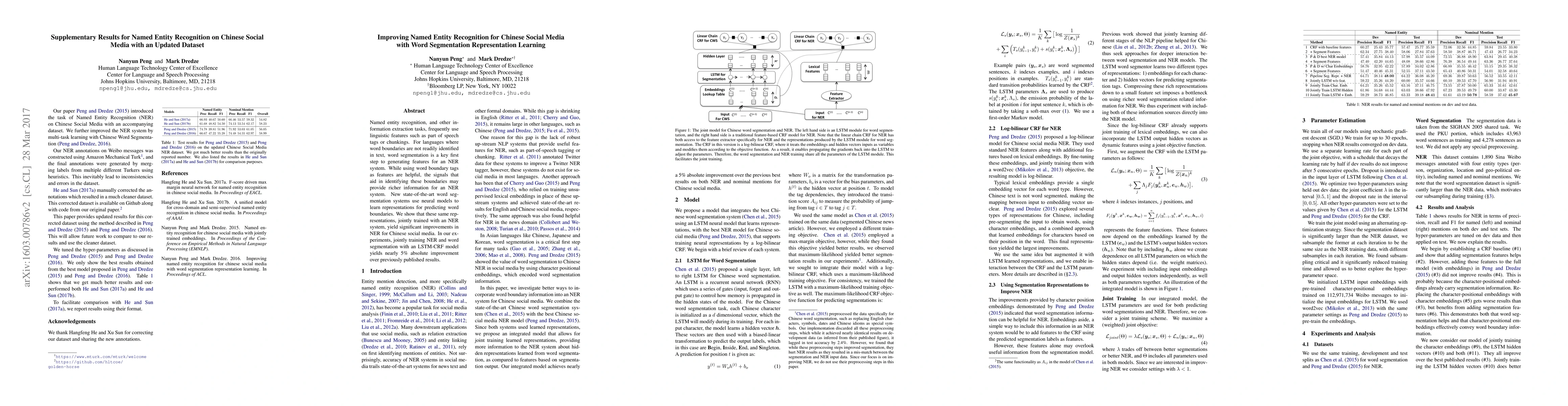 This paper demonstrates that integrating neural word segmentation representation learning into a Named Entity Recognition (NER) system significantly enhances NER performance for Chinese social media text. Jointly training NER and word segmentation with an LSTM-CRF model achieves nearly a 5% absolute improvement over previous methods.