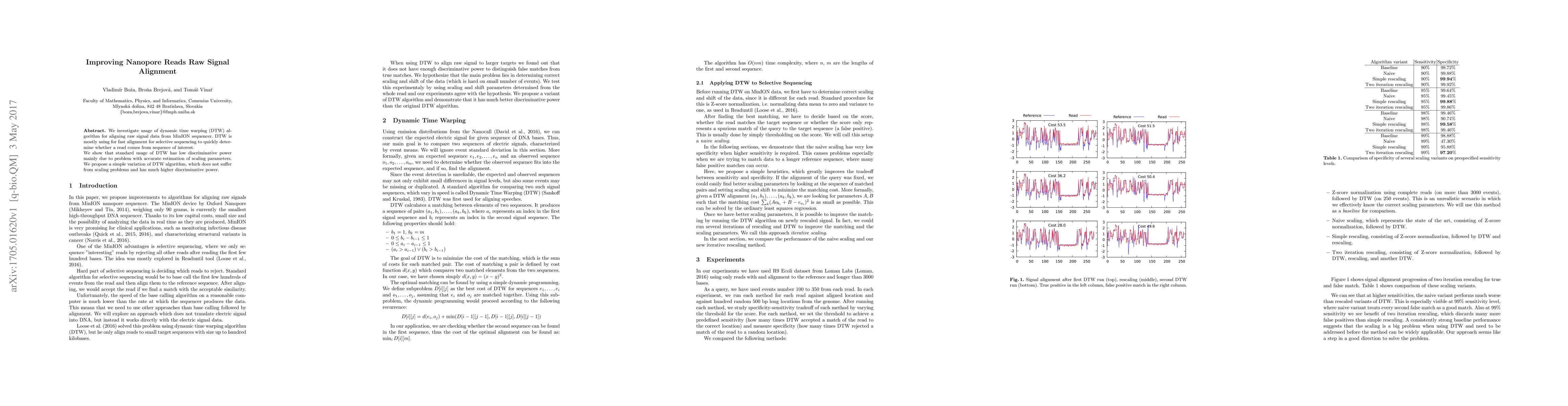 We investigate usage of dynamic time warping (DTW) algorithm for aligning raw signal data from MinION sequencer. DTW is mostly using for fast alignment for selective sequencing to quickly determine whether a read comes from sequence of interest. We show that standard usage of DTW has low discriminative power mainly due to problem with accurate estimation of scaling parameters. We propose a simple variation of DTW algorithm, which does not suffer from scaling problems and has much higher discriminative power.