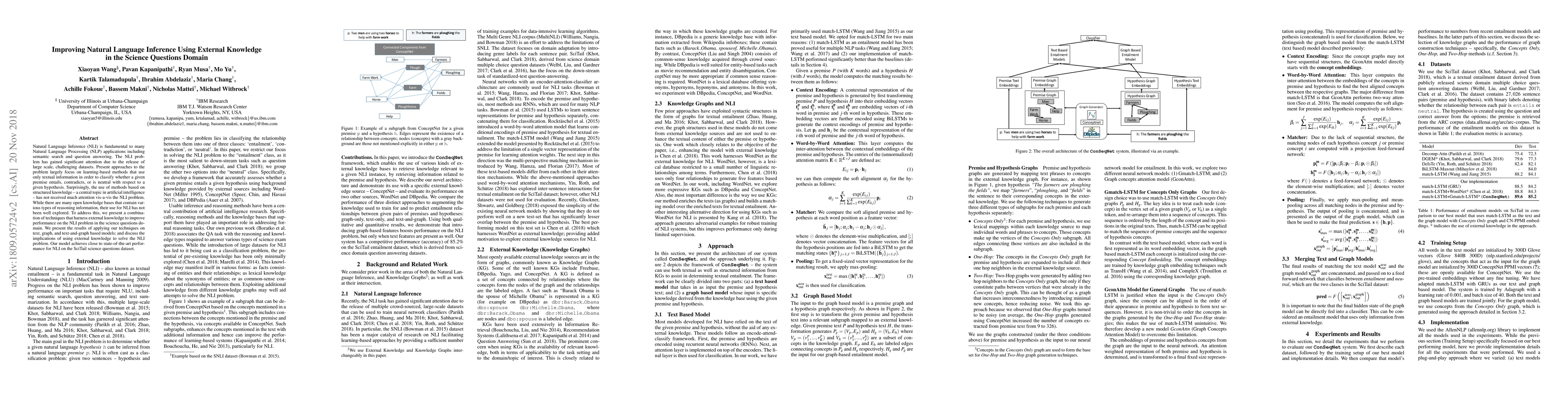 Natural Language Inference (NLI) is fundamental to many Natural Language Processing (NLP) applications including semantic search and question answering. The NLI problem has gained significant attention thanks to the release of large scale, challenging datasets. Present approaches to the problem largely focus on learning-based methods that use only textual information in order to classify whether a given premise entails, contradicts, or is neutral with respect to a given hypothesis. Surprisingly, the use of methods based on structured knowledge -- a central topic in artificial intelligence -- has not received much attention vis-a-vis the NLI problem. While there are many open knowledge bases that contain various types of reasoning information, their use for NLI has not been well explored. To address this, we present a combination of techniques that harness knowledge graphs to improve performance on the NLI problem in the science questions domain. We present the results of applying our techniques on text, graph, and text-to-graph based models, and discuss implications for the use of external knowledge in solving the NLI problem. Our model achieves the new state-of-the-art performance on the NLI problem over the SciTail science questions dataset.