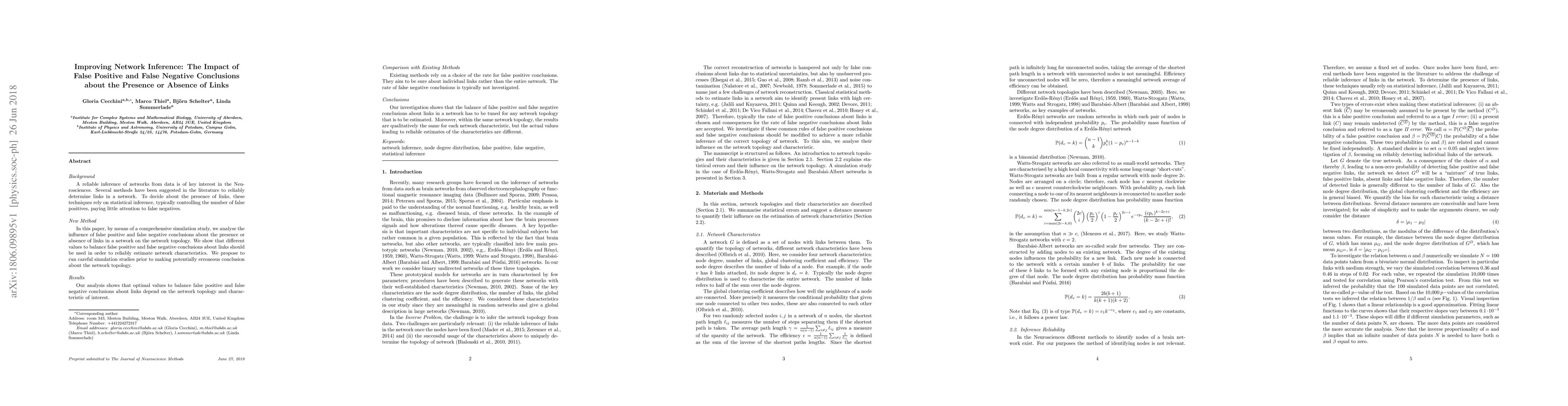 A reliable inference of networks from data is of key interest in the Neurosciences. Several methods have been suggested in the literature to reliably determine links in a network. To decide about the presence of links, these techniques rely on statistical inference, typically controlling the number of false positives, paying little attention to false negatives. In this paper, by means of a comprehensive simulation study, we analyse the influence of false positive and false negative conclusions about the presence or absence of links in a network on the network topology. We show that different values to balance false positive and false negative conclusions about links should be used in order to reliably estimate network characteristics. We propose to run careful simulation studies prior to making potentially erroneous conclusion about the network topology. Our analysis shows that optimal values to balance false positive and false negative conclusions about links depend on the network topology and characteristic of interest. Existing methods rely on a choice of the rate for false positive conclusions. They aim to be sure about individual links rather than the entire network. The rate of false negative conclusions is typically not investigated. Our investigation shows that the balance of false positive and false negative conclusions about links in a network has to be tuned for any network topology that is to be estimated. Moreover, within the same network topology, the results are qualitatively the same for each network characteristic, but the actual values leading to reliable estimates of the characteristics are different.
