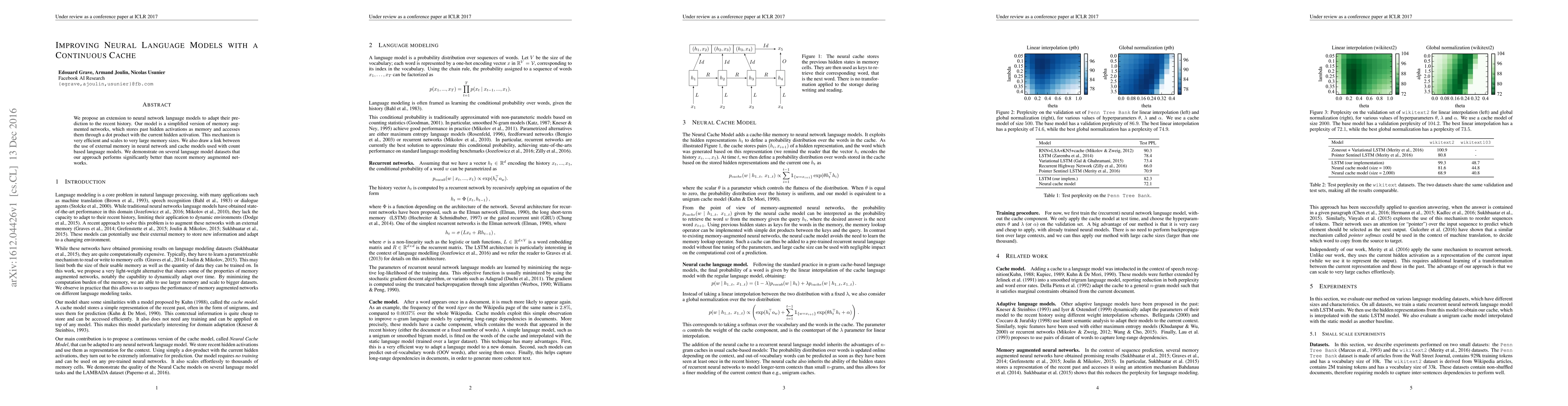 This paper introduces a neural network language model that enhances predictions by utilizing a continuous cache to store and access past hidden activations. The proposed model, efficient and scalable, outperforms recent memory augmented networks on various datasets.
