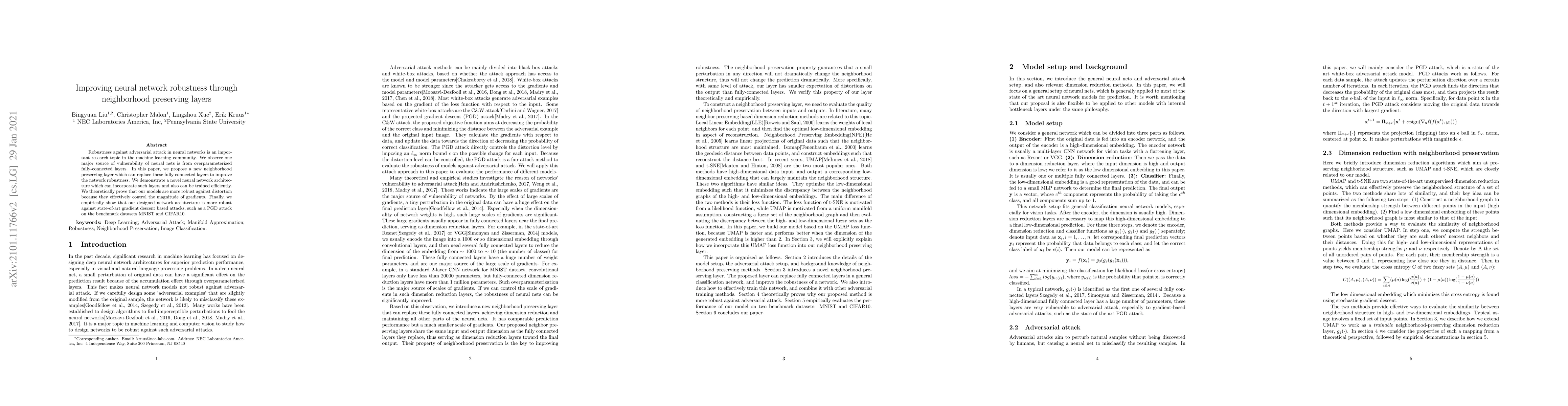 This paper proposes a novel neighborhood preserving layer to replace overparameterized fully-connected layers in neural networks, enhancing robustness against adversarial attacks. Theoretical proofs and empirical results on MNIST and CIFAR10 datasets demonstrate improved resilience to gradient descent-based attacks like PGD.