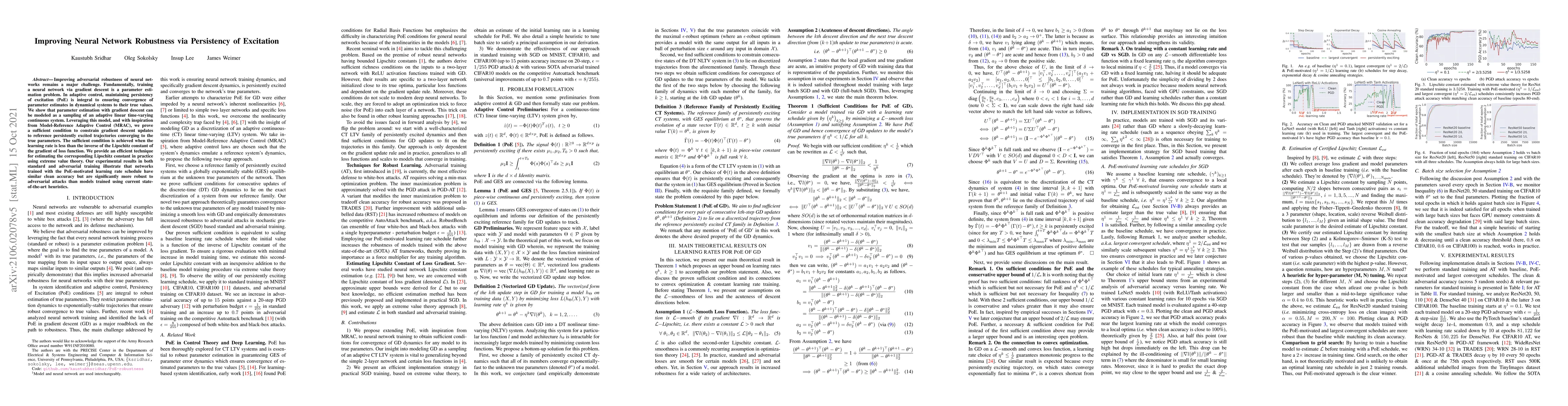 Improving adversarial robustness of neural networks remains a major challenge. Fundamentally, training a neural network via gradient descent is a parameter estimation problem. In adaptive control, maintaining persistency of excitation (PoE) is integral to ensuring convergence of parameter estimates in dynamical systems to their true values. We show that parameter estimation with gradient descent can be modeled as a sampling of an adaptive linear time-varying continuous system. Leveraging this model, and with inspiration from Model-Reference Adaptive Control (MRAC), we prove a sufficient condition to constrain gradient descent updates to reference persistently excited trajectories converging to the true parameters. The sufficient condition is achieved when the learning rate is less than the inverse of the Lipschitz constant of the gradient of loss function. We provide an efficient technique for estimating the corresponding Lipschitz constant in practice using extreme value theory. Our experimental results in both standard and adversarial training illustrate that networks trained with the PoE-motivated learning rate schedule have similar clean accuracy but are significantly more robust to adversarial attacks than models trained using current state-of-the-art heuristics.