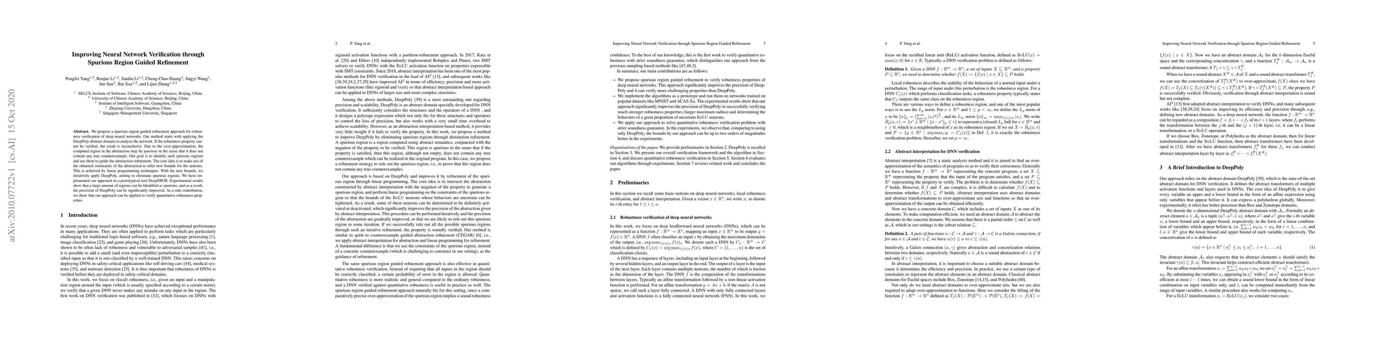 We propose a spurious region guided refinement approach for robustness verification of deep neural networks. Our method starts with applying the DeepPoly abstract domain to analyze the network. If the robustness property cannot be verified, the result is inconclusive. Due to the over-approximation, the computed region in the abstraction may be spurious in the sense that it does not contain any true counterexample. Our goal is to identify such spurious regions and use them to guide the abstraction refinement. The core idea is to make use of the obtained constraints of the abstraction to infer new bounds for the neurons. This is achieved by linear programming techniques. With the new bounds, we iteratively apply DeepPoly, aiming to eliminate spurious regions. We have implemented our approach in a prototypical tool DeepSRGR. Experimental results show that a large amount of regions can be identified as spurious, and as a result, the precision of DeepPoly can be significantly improved. As a side contribution, we show that our approach can be applied to verify quantitative robustness properties.