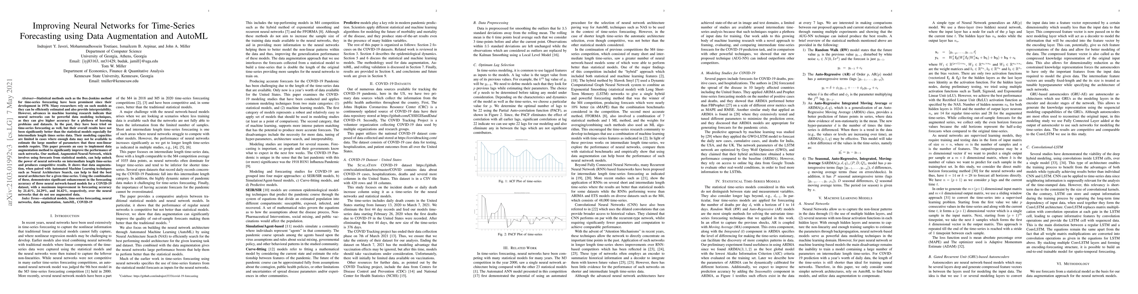 This paper proposes a data augmentation method combined with Automated Machine Learning to enhance neural networks for time-series forecasting, particularly for intermediate length datasets. The Augmented-Neural-Network approach, which leverages forecasts from statistical models, significantly improves neural network performance, achieving up to 24.29% better accuracy for COVID-19 forecasting compared to non-augmented neural networks.