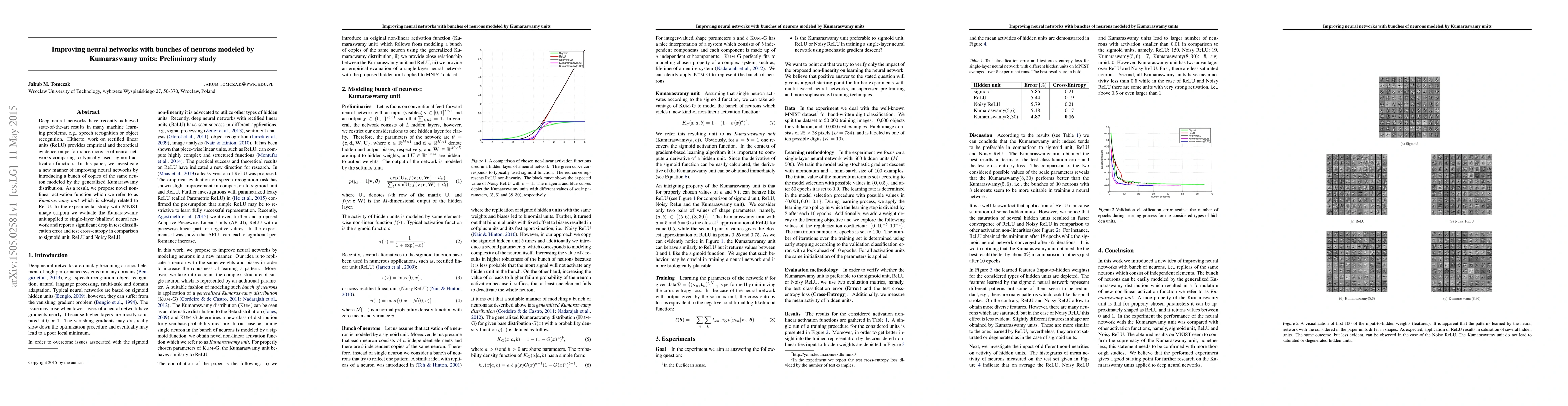 Deep neural networks have recently achieved state-of-the-art results in many machine learning problems, e.g., speech recognition or object recognition. Hitherto, work on rectified linear units (ReLU) provides empirical and theoretical evidence on performance increase of neural networks comparing to typically used sigmoid activation function. In this paper, we investigate a new manner of improving neural networks by introducing a bunch of copies of the same neuron modeled by the generalized Kumaraswamy distribution. As a result, we propose novel non-linear activation function which we refer to as Kumaraswamy unit which is closely related to ReLU. In the experimental study with MNIST image corpora we evaluate the Kumaraswamy unit applied to single-layer (shallow) neural network and report a significant drop in test classification error and test cross-entropy in comparison to sigmoid unit, ReLU and Noisy ReLU.