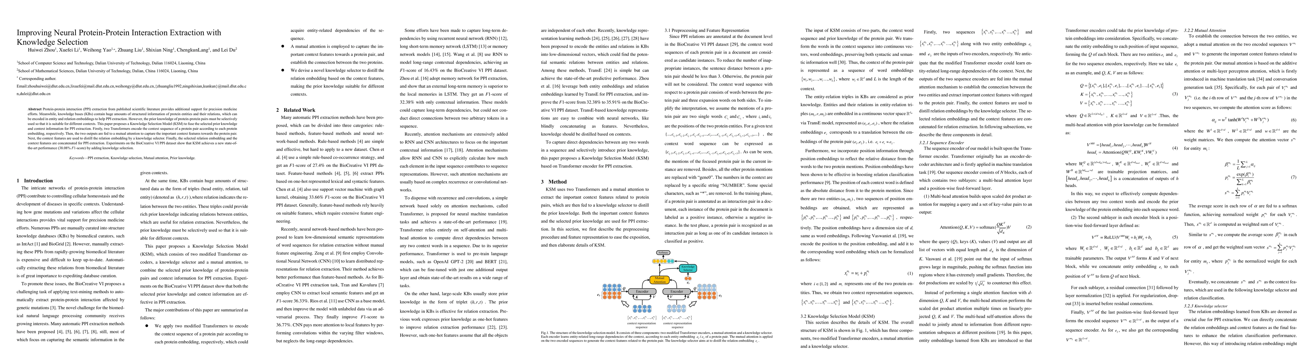 This paper proposes a Knowledge Selection Model (KSM) to enhance protein-protein interaction extraction using knowledge bases. It fuses selected prior knowledge with context information through Transformers and mutual attention, achieving a state-of-the-art F1-score of 38.08% on the BioCreative VI dataset.