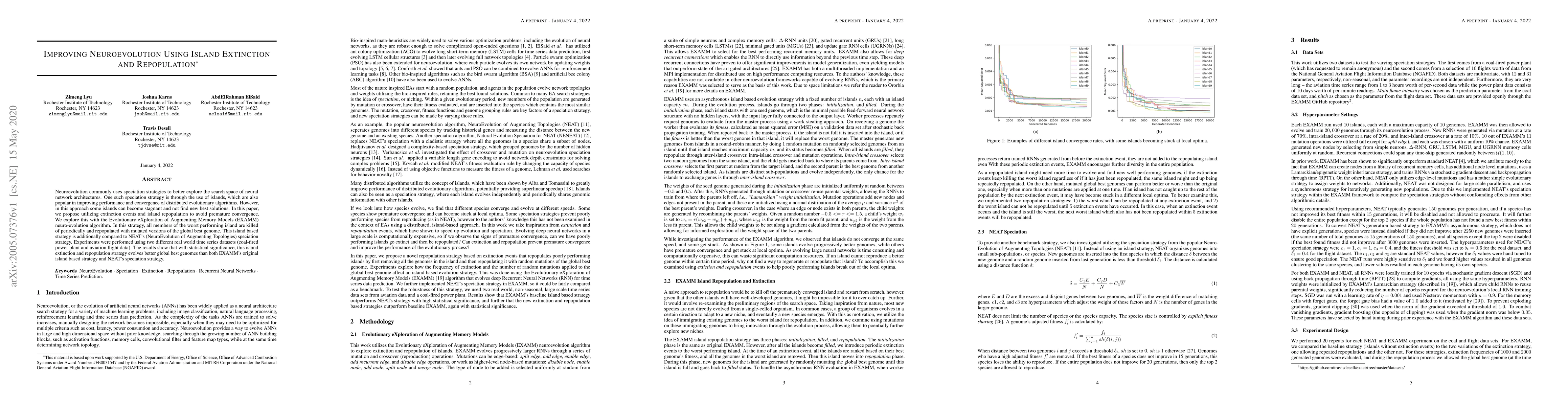 This paper proposes an island extinction and repopulation strategy to enhance neuroevolution, showing that it outperforms both the original island-based EXAMM algorithm and NEAT's speciation strategy in evolving better global best genomes, as demonstrated through experiments on real-world time series datasets.