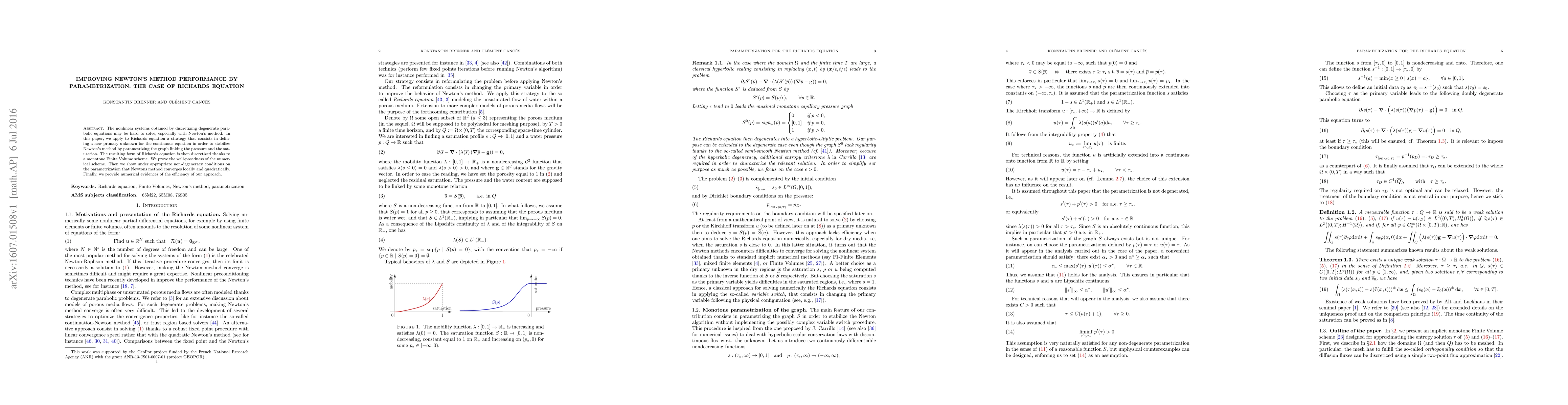 The nonlinear systems obtained by discretizing degenerate parabolic equations may be hard to solve, especially with Newton's method. In this paper, we apply to Richards equation a strategy that consists in defining a new primary unknown for the continuous equation in order to stabilize Newton's method by parametrizing the graph linking the pressure and the saturation. The resulting form of Richards equation is then discretized thanks to a monotone Finite Volume scheme. We prove the well-posedness of the numerical scheme. Then we show under appropriate non-degeneracy conditions on the parametrization that Newton\^as method converges locally and quadratically. Finally, we provide numerical evidences of the efficiency of our approach.
