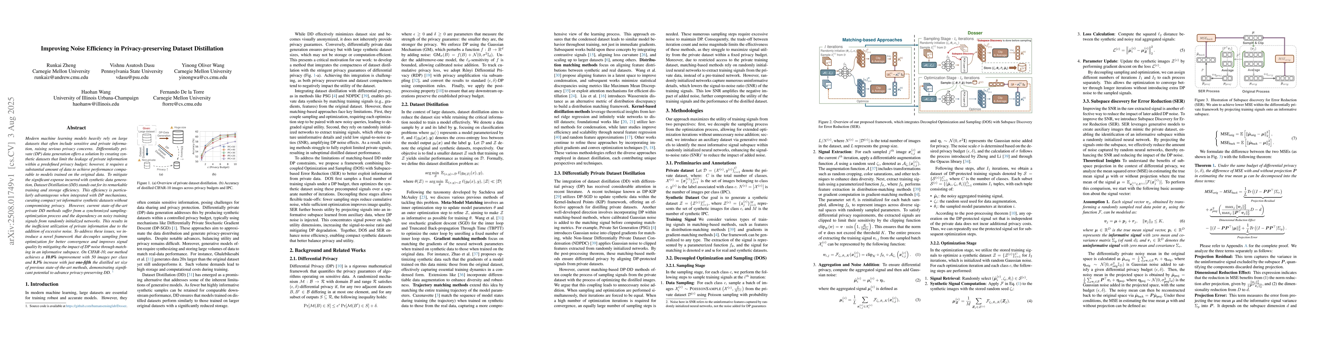 Modern machine learning models heavily rely on large datasets that often include sensitive and private information, raising serious privacy concerns. Differentially private (DP) data generation offers a solution by creating synthetic datasets that limit the leakage of private information within a predefined privacy budget; however, it requires a substantial amount of data to achieve performance comparable to models trained on the original data. To mitigate the significant expense incurred with synthetic data generation, Dataset Distillation (DD) stands out for its remarkable training and storage efficiency. This efficiency is particularly advantageous when integrated with DP mechanisms, curating compact yet informative synthetic datasets without compromising privacy. However, current state-of-the-art private DD methods suffer from a synchronized sampling-optimization process and the dependency on noisy training signals from randomly initialized networks. This results in the inefficient utilization of private information due to the addition of excessive noise. To address these issues, we introduce a novel framework that decouples sampling from optimization for better convergence and improves signal quality by mitigating the impact of DP noise through matching in an informative subspace. On CIFAR-10, our method achieves a \textbf{10.0\%} improvement with 50 images per class and \textbf{8.3\%} increase with just \textbf{one-fifth} the distilled set size of previous state-of-the-art methods, demonstrating significant potential to advance privacy-preserving DD.