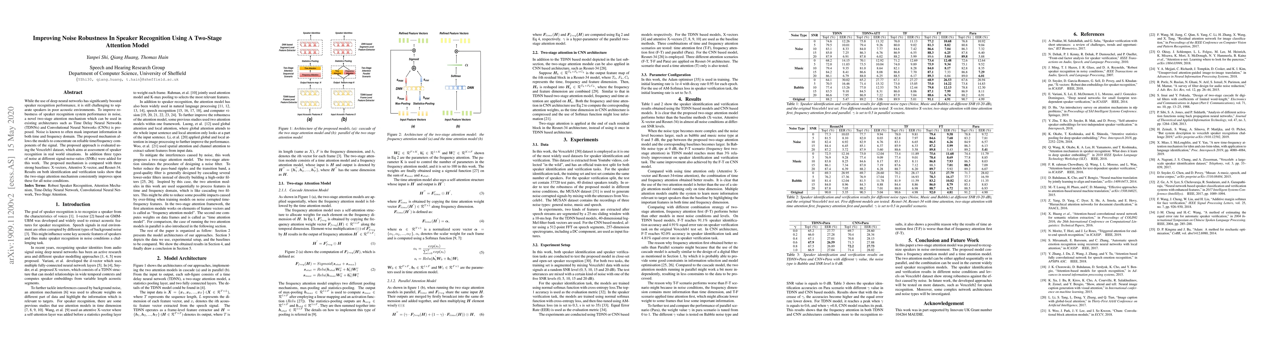 While the use of deep neural networks has significantly boosted speaker recognition performance, it is still challenging to separate speakers in poor acoustic environments. To improve robustness of speaker recognition system performance in noise, a novel two-stage attention mechanism which can be used in existing architectures such as Time Delay Neural Networks (TDNNs) and Convolutional Neural Networks (CNNs) is proposed. Noise is known to often mask important information in both time and frequency domain. The proposed mechanism allows the models to concentrate on reliable time/frequency components of the signal. The proposed approach is evaluated using the Voxceleb1 dataset, which aims at assessment of speaker recognition in real world situations. In addition three types of noise at different signal-noise-ratios (SNRs) were added for this work. The proposed mechanism is compared with three strong baselines: X-vectors, Attentive X-vector, and Resnet-34. Results on both identification and verification tasks show that the two-stage attention mechanism consistently improves upon these for all noise conditions.