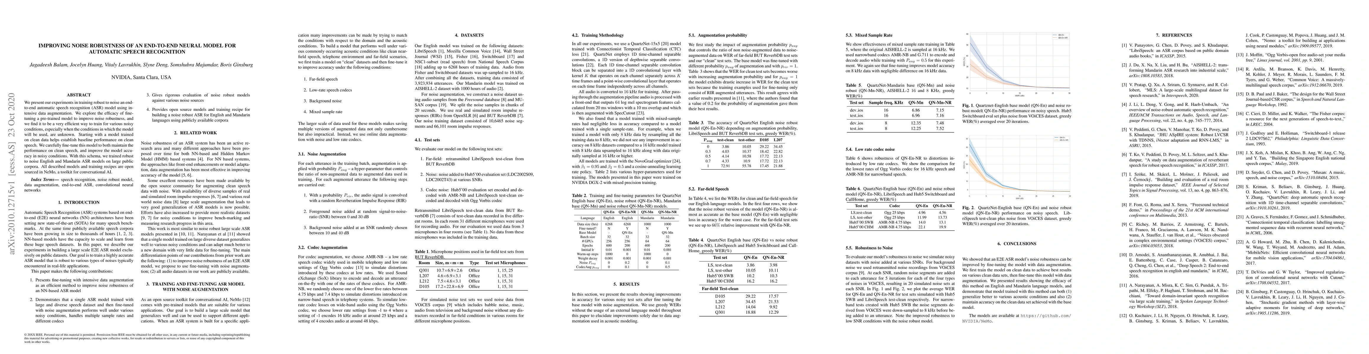 We present our experiments in training robust to noise an end-to-end automatic speech recognition (ASR) model using intensive data augmentation. We explore the efficacy of fine-tuning a pre-trained model to improve noise robustness, and we find it to be a very efficient way to train for various noisy conditions, especially when the conditions in which the model will be used, are unknown. Starting with a model trained on clean data helps establish baseline performance on clean speech. We carefully fine-tune this model to both maintain the performance on clean speech, and improve the model accuracy in noisy conditions. With this schema, we trained robust to noise English and Mandarin ASR models on large public corpora. All described models and training recipes are open sourced in NeMo, a toolkit for conversational AI.