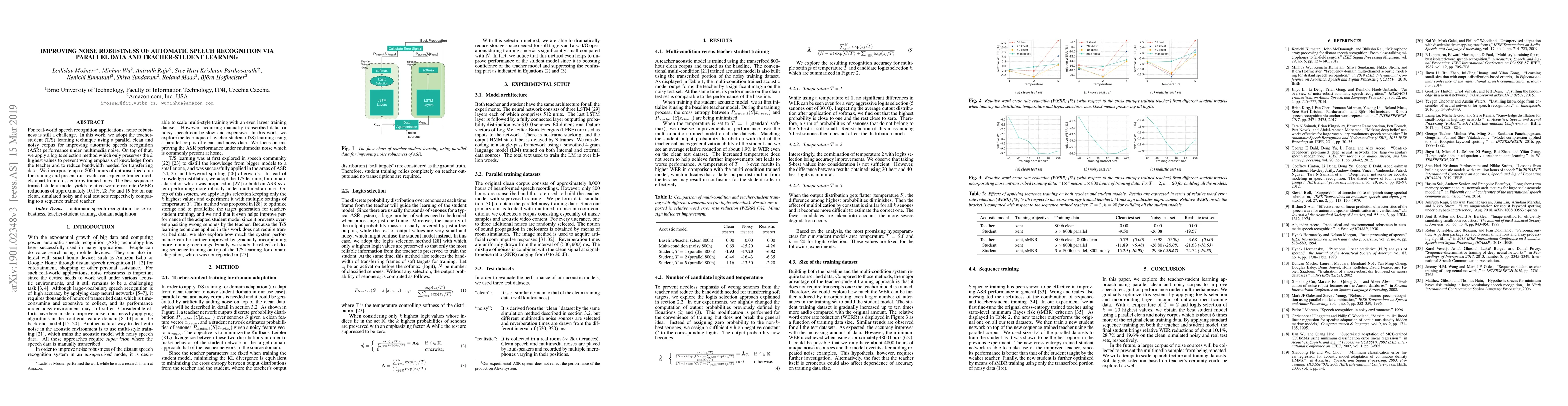 This paper explores the use of teacher-student learning with parallel clean and noisy data to enhance noise robustness in automatic speech recognition (ASR). The study employs a logits selection method to focus on the most significant outputs, achieving notable improvements in word error rates across various noise conditions.