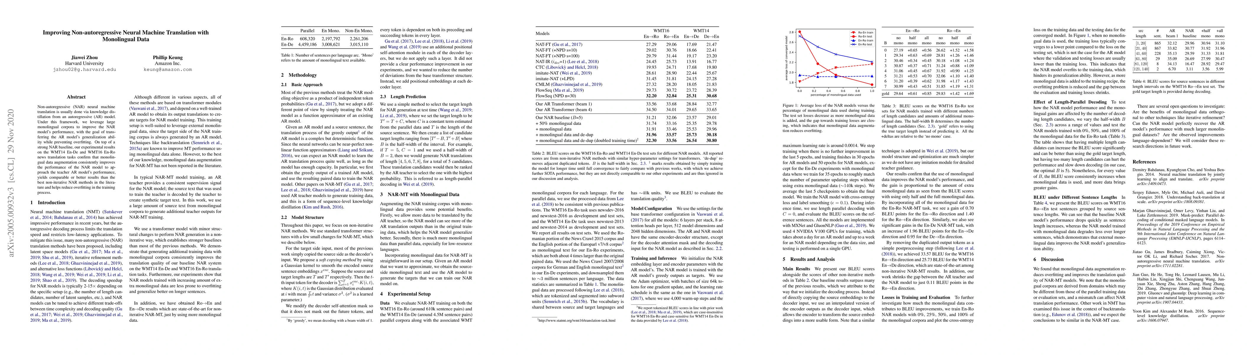 This paper explores enhancing non-autoregressive (NAR) neural machine translation through knowledge distillation from autoregressive (AR) models, using large monolingual corpora to improve generalization and reduce overfitting. Experimental results show that incorporating monolingual data augmentation significantly boosts NAR model performance on WMT14 En-De and WMT16 En-Ro tasks, approaching AR model results and outperforming existing non-iterative NAR methods.