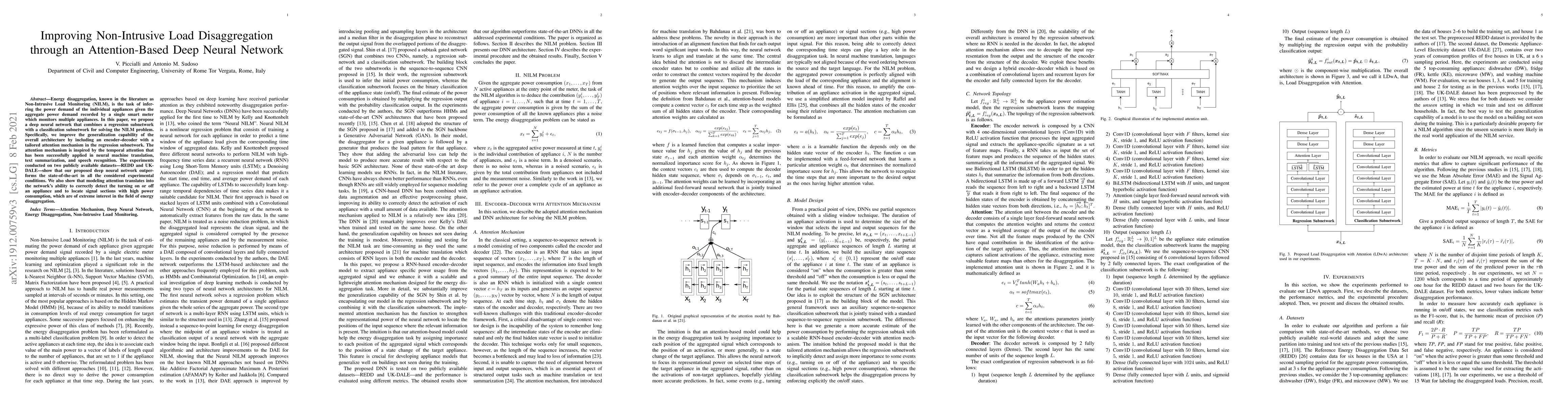This paper proposes a deep neural network combining regression and classification subnetworks with an attention-based encoder-decoder for Non-Intrusive Load Monitoring (NILM). The attention mechanism enhances generalization and outperforms state-of-the-art methods on two datasets, demonstrating improved appliance detection and high power consumption localization.