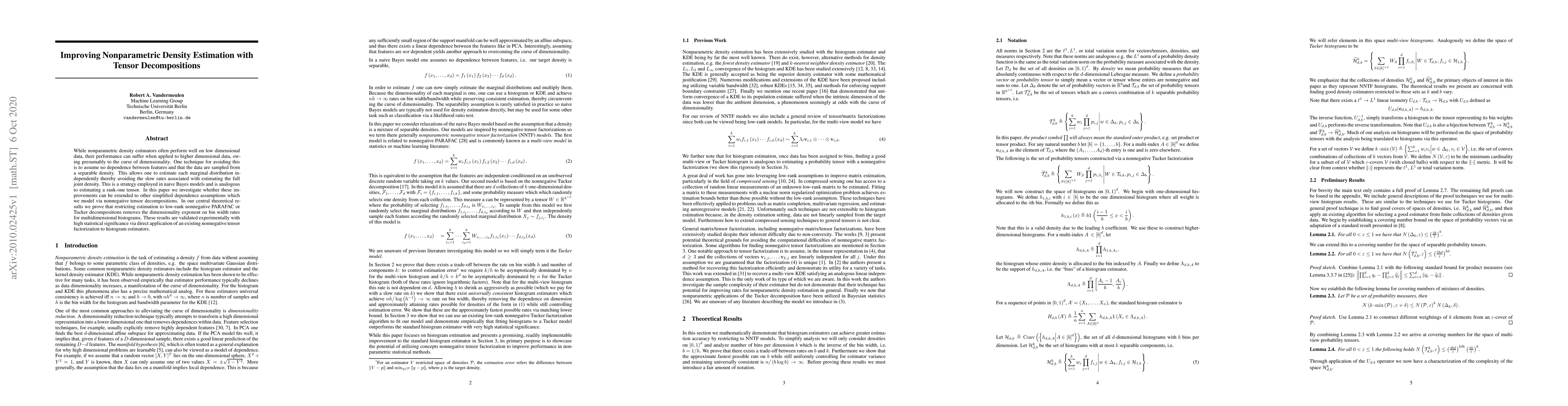 This paper explores enhancing nonparametric density estimation using tensor decompositions to mitigate the curse of dimensionality. It demonstrates that low-rank nonnegative PARAFAC or Tucker decompositions can improve density estimation by removing the dimensionality exponent on bin width rates, validated through significant experimental results.