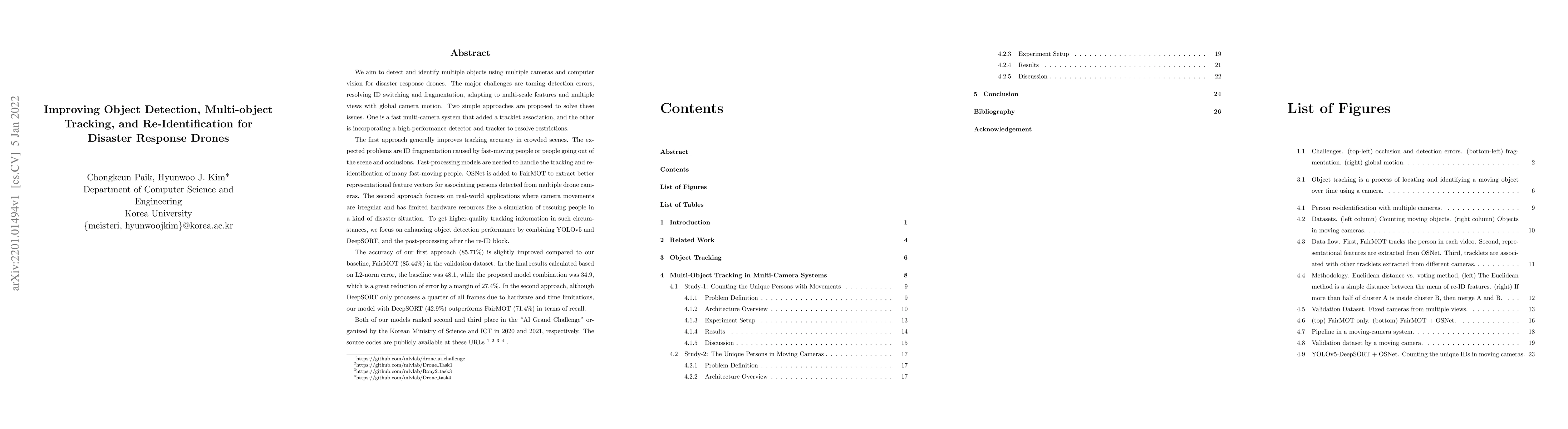 We aim to detect and identify multiple objects using multiple cameras and computer vision for disaster response drones. The major challenges are taming detection errors, resolving ID switching and fragmentation, adapting to multi-scale features and multiple views with global camera motion. Two simple approaches are proposed to solve these issues. One is a fast multi-camera system that added a tracklet association, and the other is incorporating a high-performance detector and tracker to resolve restrictions. (...) The accuracy of our first approach (85.71%) is slightly improved compared to our baseline, FairMOT (85.44%) in the validation dataset. In the final results calculated based on L2-norm error, the baseline was 48.1, while the proposed model combination was 34.9, which is a great reduction of error by a margin of 27.4%. In the second approach, although DeepSORT only processes a quarter of all frames due to hardware and time limitations, our model with DeepSORT (42.9%) outperforms FairMOT (71.4%) in terms of recall. Both of our models ranked second and third place in the `AI Grand Challenge' organized by the Korean Ministry of Science and ICT in 2020 and 2021, respectively. The source codes are publicly available at these URLs (github.com/mlvlab/drone_ai_challenge, github.com/mlvlab/Drone_Task1, github.com/mlvlab/Rony2_task3, github.com/mlvlab/Drone_task4).