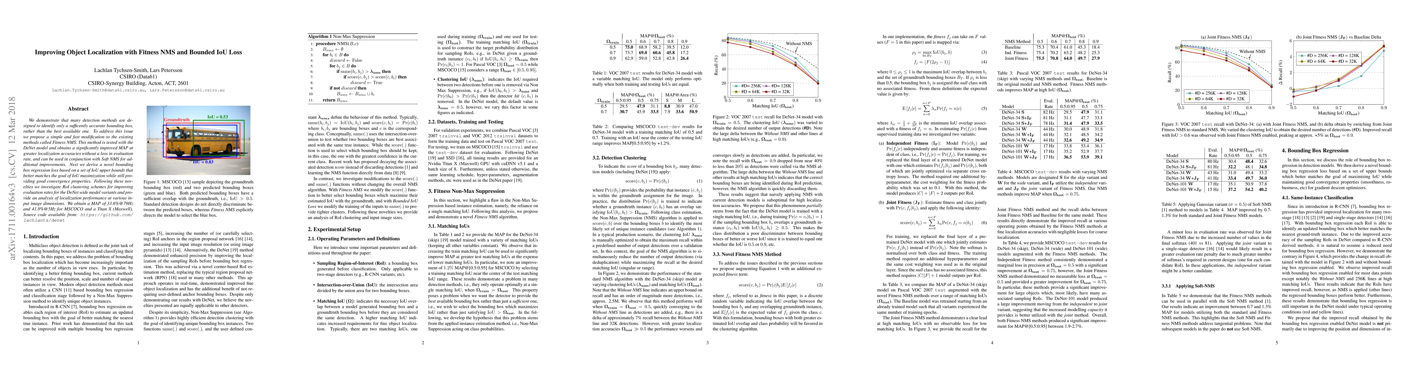 This paper proposes Fitness NMS to enhance object localization accuracy by identifying the best possible bounding box, tested with DeNet, achieving improved mean average precision (MAP) without sacrificing evaluation rates. It also introduces a novel Bounded IoU loss for better convergence and localization performance, achieving 33.6% MAP at 79Hz on MSCOCO.