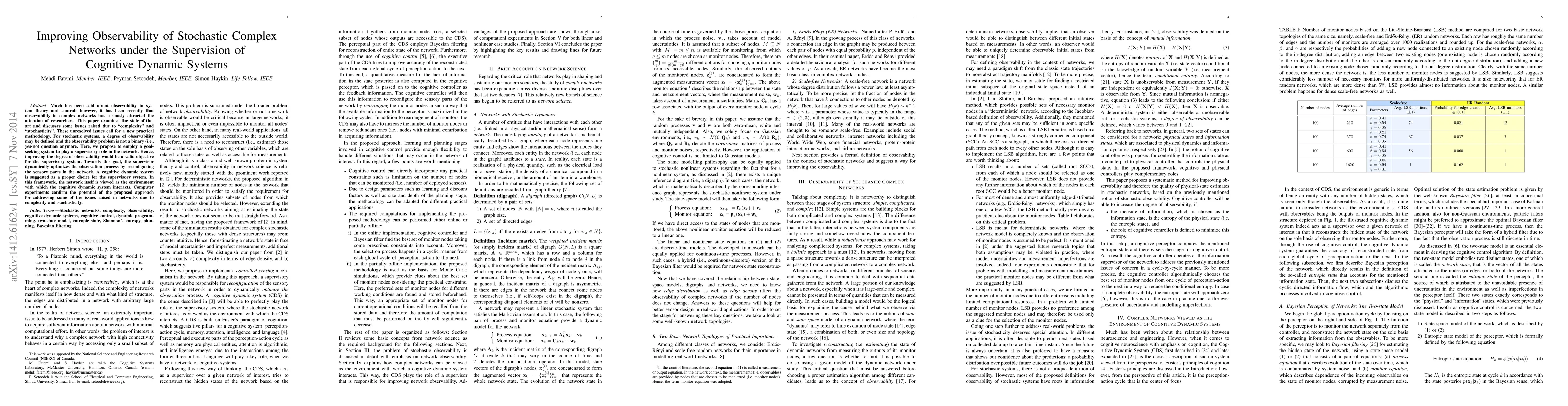 Much has been said about observability in system theory and control; however, it has been recently that observability in complex networks has seriously attracted the attention of researchers. This paper examines the state-of-the-art and discusses some issues raised due to "complexity" and "stochasticity". These unresolved issues call for a new practical methodology. For stochastic systems, a degree of observability may be defined and the observability problem is not a binary (i.e., yes-no) question anymore. Here, we propose to employ a goal-seeking system to play a supervisory role in the network. Hence, improving the degree of observability would be a valid objective for the supervisory system. Towards this goal, the supervisor dynamically optimizes the observation process by reconfiguring the sensory parts in the network. A cognitive dynamic system is suggested as a proper choice for the supervisory system. In this framework, the network itself is viewed as the environment with which the cognitive dynamic system interacts. Computer experiments confirm the potential of the proposed approach for addressing some of the issues raised in networks due to complexity and stochasticity.