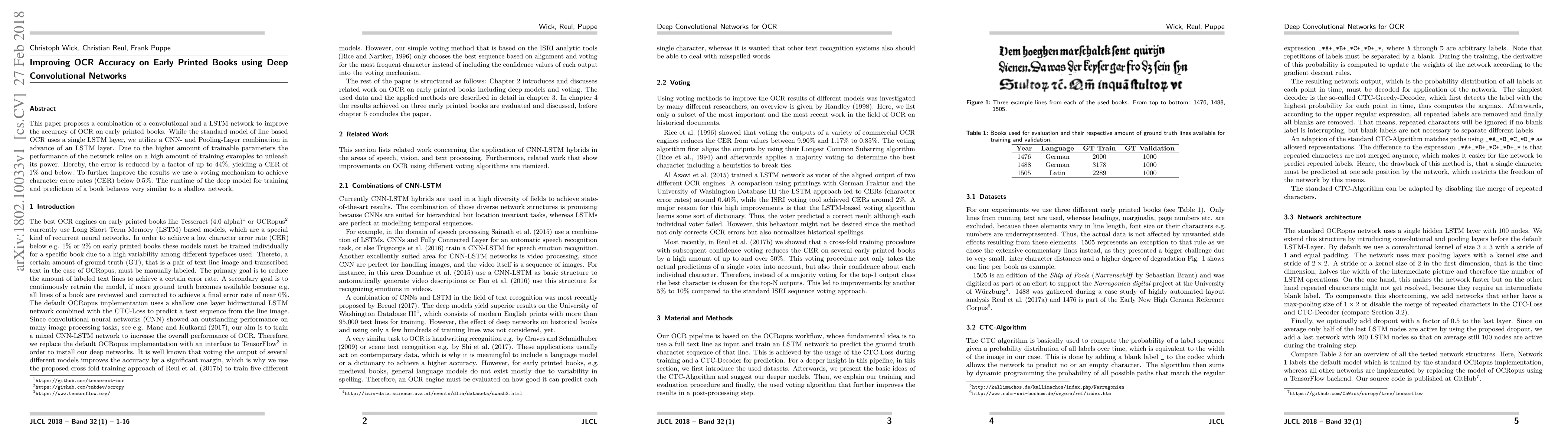 A deep convolutional network with a combination of CNN and LSTM improves OCR accuracy on early printed books by 44% compared to traditional models, achieving CERs below 1%. A voting mechanism further reduces errors to <0.5%.