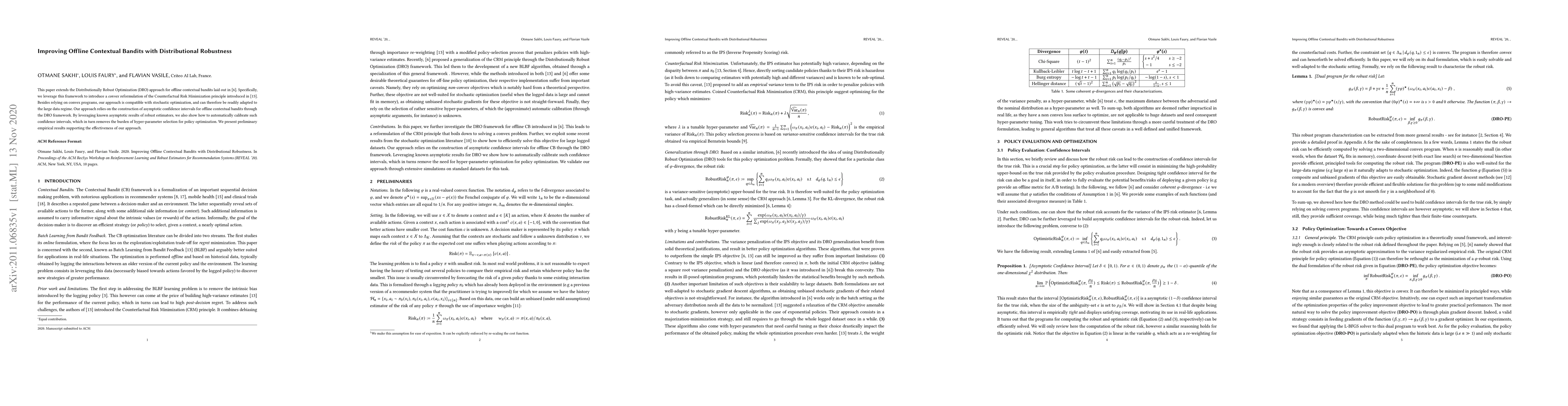This paper proposes a robust optimization framework for offline contextual bandits using Distributionally Robust Optimization (DRO) to reformulate the Counterfactual Risk Minimization principle. The approach facilitates calibration of confidence intervals, eliminating the need for hyperparameter tuning, and is adaptable to large datasets.