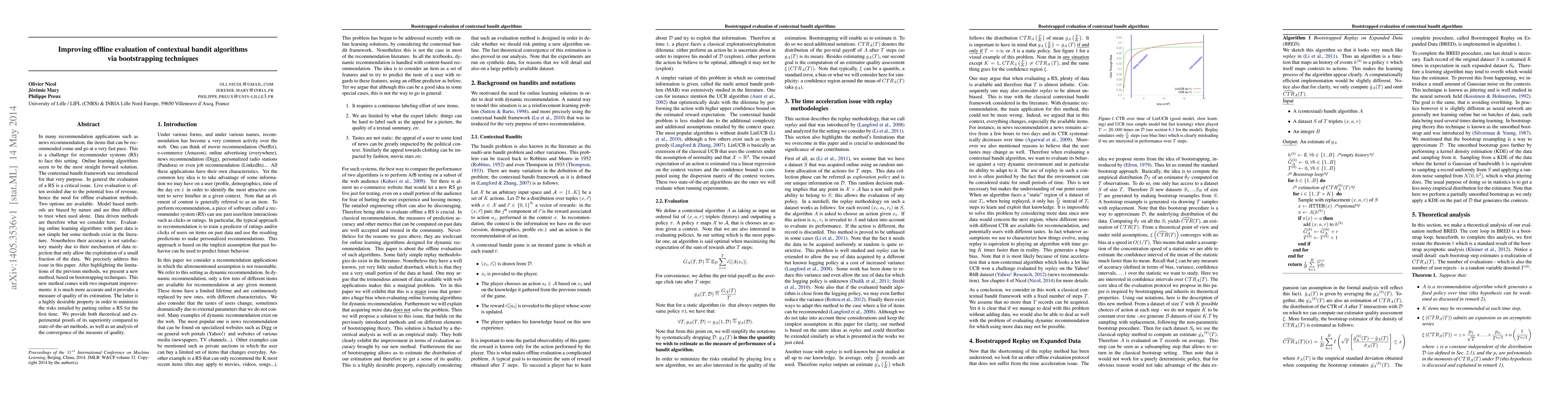 In many recommendation applications such as news recommendation, the items that can be rec- ommended come and go at a very fast pace. This is a challenge for recommender systems (RS) to face this setting. Online learning algorithms seem to be the most straight forward solution. The contextual bandit framework was introduced for that very purpose. In general the evaluation of a RS is a critical issue. Live evaluation is of- ten avoided due to the potential loss of revenue, hence the need for offline evaluation methods. Two options are available. Model based meth- ods are biased by nature and are thus difficult to trust when used alone. Data driven methods are therefore what we consider here. Evaluat- ing online learning algorithms with past data is not simple but some methods exist in the litera- ture. Nonetheless their accuracy is not satisfac- tory mainly due to their mechanism of data re- jection that only allow the exploitation of a small fraction of the data. We precisely address this issue in this paper. After highlighting the limita- tions of the previous methods, we present a new method, based on bootstrapping techniques. This new method comes with two important improve- ments: it is much more accurate and it provides a measure of quality of its estimation. The latter is a highly desirable property in order to minimize the risks entailed by putting online a RS for the first time. We provide both theoretical and ex- perimental proofs of its superiority compared to state-of-the-art methods, as well as an analysis of the convergence of the measure of quality.