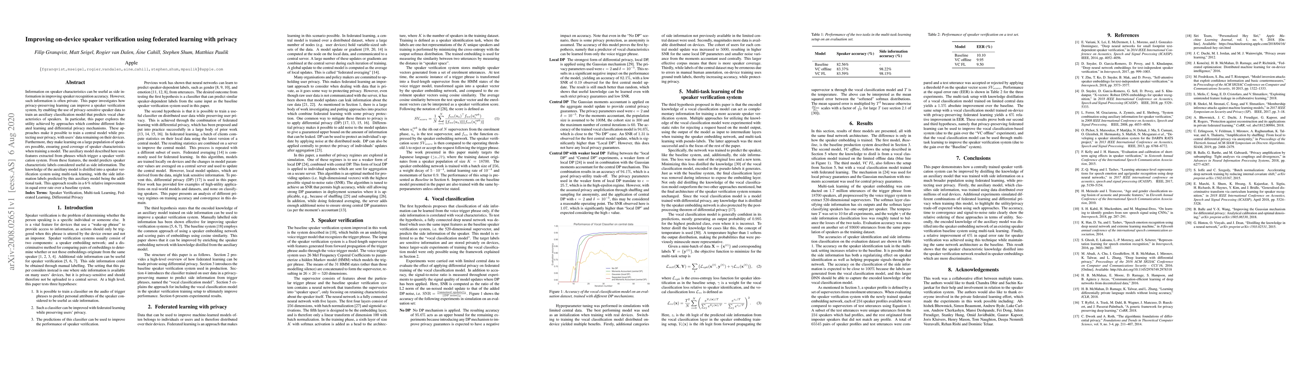 This paper explores federated learning and differential privacy to enhance on-device speaker verification by training an auxiliary model on privacy-sensitive speaker data, achieving a 6% relative improvement in equal error rate over a baseline system while ensuring user privacy.