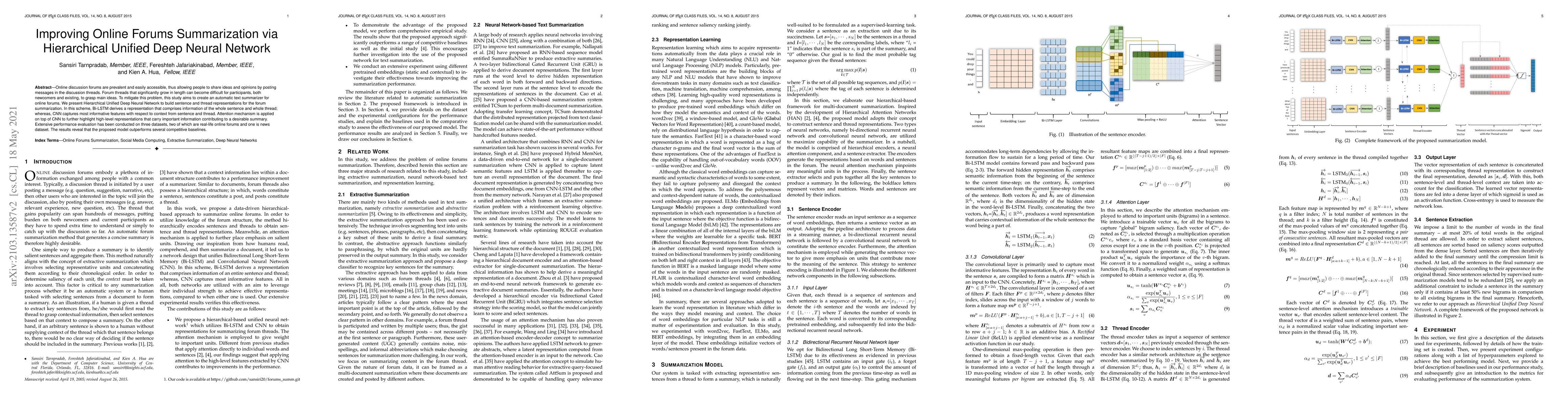 This research introduces a Hierarchical Unified Deep Neural Network for summarizing long online forum threads, aiming to make discussions more accessible. The model uses Bi-LSTM and CNN to capture sentence and thread-level information, with an attention mechanism to highlight key points, and demonstrates superior performance over baseline methods in evaluations on real-life forum and news datasets.