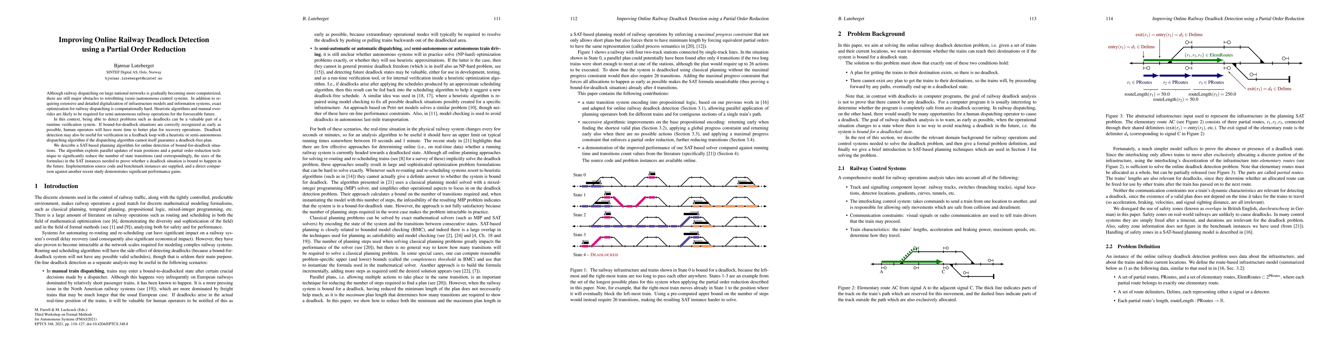 Although railway dispatching on large national networks is gradually becoming more computerized, there are still major obstacles to retrofitting (semi-)autonomous control systems. In addition to requiring extensive and detailed digitalization of infrastructure models and information systems, exact optimization for railway dispatching is computationally hard. Heuristic algorithms and manual overrides are likely to be required for semi-autonomous railway operations for the foreseeable future. In this context, being able to detect problems such as deadlocks can be a valuable part of a runtime verification system. If bound-for-deadlock situations are correctly recognized as early as possible, human operators will have more time to better plan for recovery operations. Deadlock detection may also be useful for verification in a feedback loop with a heuristic or semi-autonomous dispatching algorithm if the dispatching algorithm cannot itself guarantee a deadlock-free plan. We describe a SAT-based planning algorithm for online detection of bound-for-deadlock situations. The algorithm exploits parallel updates of train positions and a partial order reduction technique to significantly reduce the number of state transitions (and correspondingly, the sizes of the formulas) in the SAT instances needed to prove whether a deadlock situation is bound to happen in the future. Implementation source code and benchmark instances are supplied, and a direct comparison against another recent study demonstrates significant performance gains.