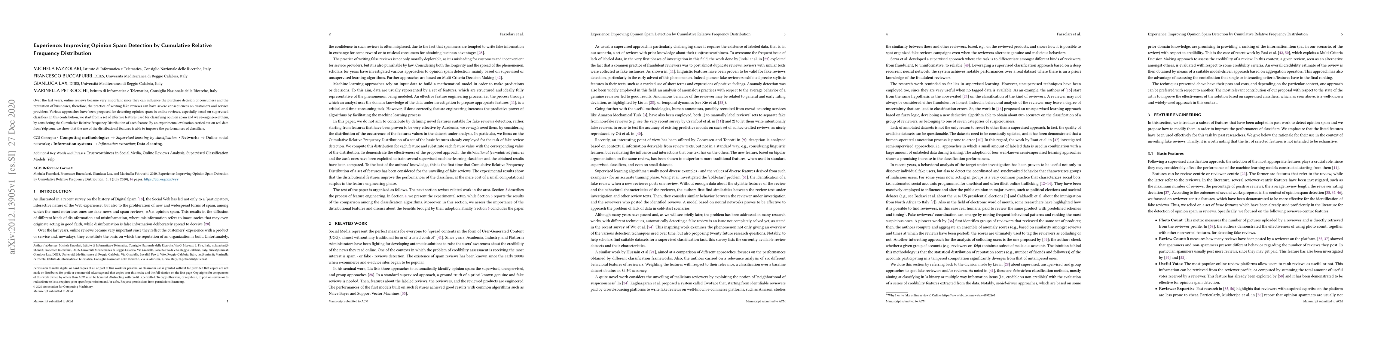 Over the last years, online reviews became very important since they can influence the purchase decision of consumers and the reputation of businesses, therefore, the practice of writing fake reviews can have severe consequences on customers and service providers. Various approaches have been proposed for detecting opinion spam in online reviews, especially based on supervised classifiers. In this contribution, we start from a set of effective features used for classifying opinion spam and we re-engineered them, by considering the Cumulative Relative Frequency Distribution of each feature. By an experimental evaluation carried out on real data from Yelp.com, we show that the use of the distributional features is able to improve the performances of classifiers.
