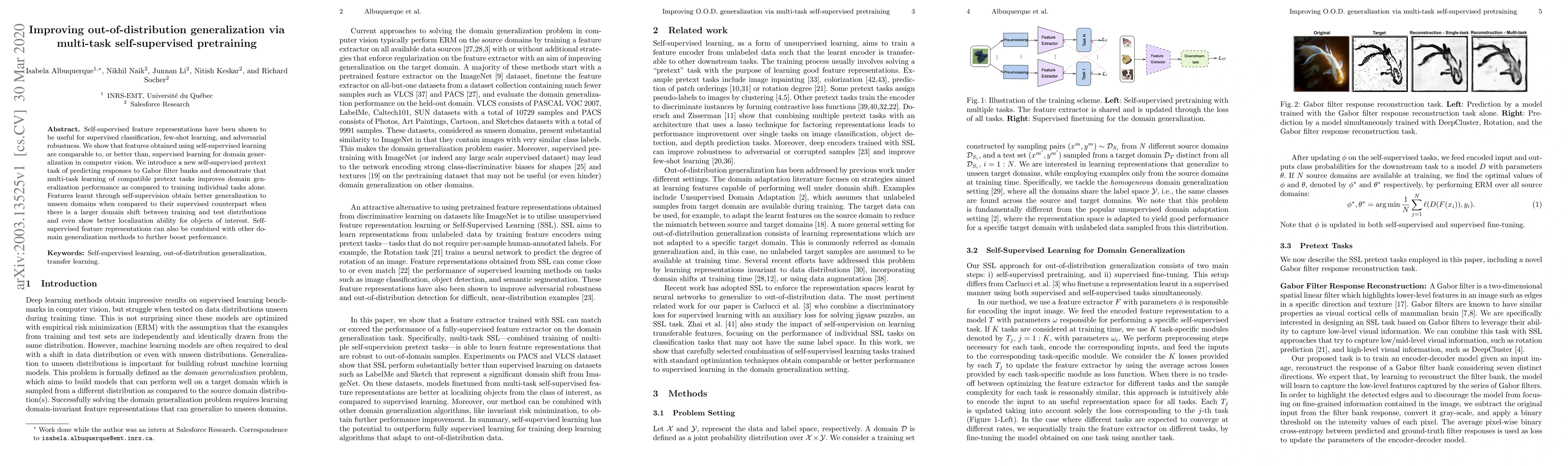 This paper demonstrates that self-supervised learning, particularly through multi-task learning with a new pretext task involving Gabor filters, enhances out-of-distribution generalization in computer vision compared to supervised learning. It shows that self-supervised features improve domain generalization, especially under larger domain shifts, and can synergize with other domain generalization techniques.