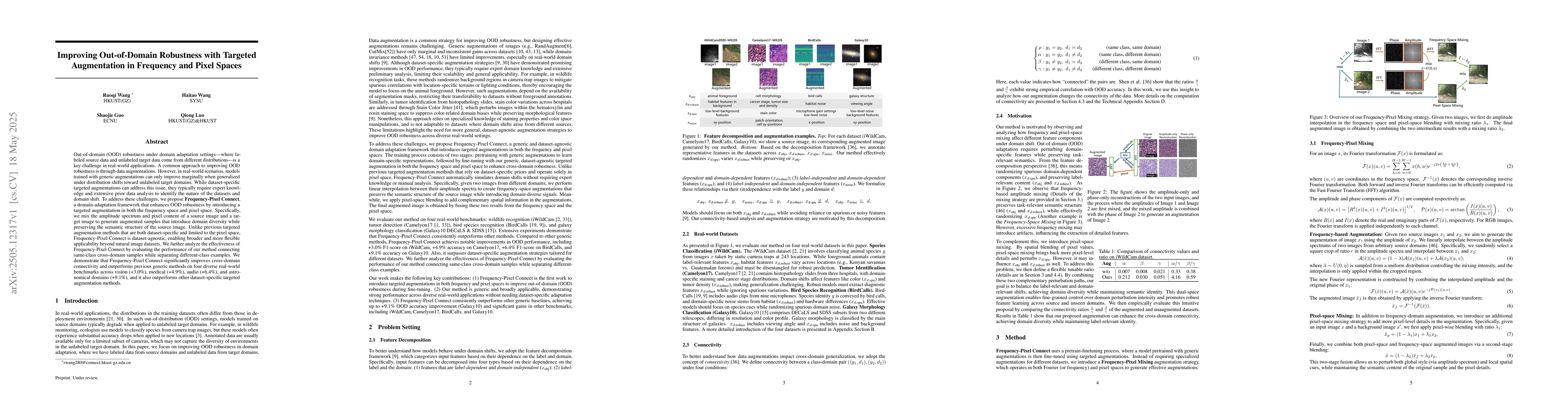 Out-of-domain (OOD) robustness under domain adaptation settings, where labeled source data and unlabeled target data come from different distributions, is a key challenge in real-world applications. A common approach to improving OOD robustness is through data augmentations. However, in real-world scenarios, models trained with generic augmentations can only improve marginally when generalized under distribution shifts toward unlabeled target domains. While dataset-specific targeted augmentations can address this issue, they typically require expert knowledge and extensive prior data analysis to identify the nature of the datasets and domain shift. To address these challenges, we propose Frequency-Pixel Connect, a domain-adaptation framework that enhances OOD robustness by introducing a targeted augmentation in both the frequency space and pixel space. Specifically, we mix the amplitude spectrum and pixel content of a source image and a target image to generate augmented samples that introduce domain diversity while preserving the semantic structure of the source image. Unlike previous targeted augmentation methods that are both dataset-specific and limited to the pixel space, Frequency-Pixel Connect is dataset-agnostic, enabling broader and more flexible applicability beyond natural image datasets. We further analyze the effectiveness of Frequency-Pixel Connect by evaluating the performance of our method connecting same-class cross-domain samples while separating different-class examples. We demonstrate that Frequency-Pixel Connect significantly improves cross-domain connectivity and outperforms previous generic methods on four diverse real-world benchmarks across vision, medical, audio, and astronomical domains, and it also outperforms other dataset-specific targeted augmentation methods.