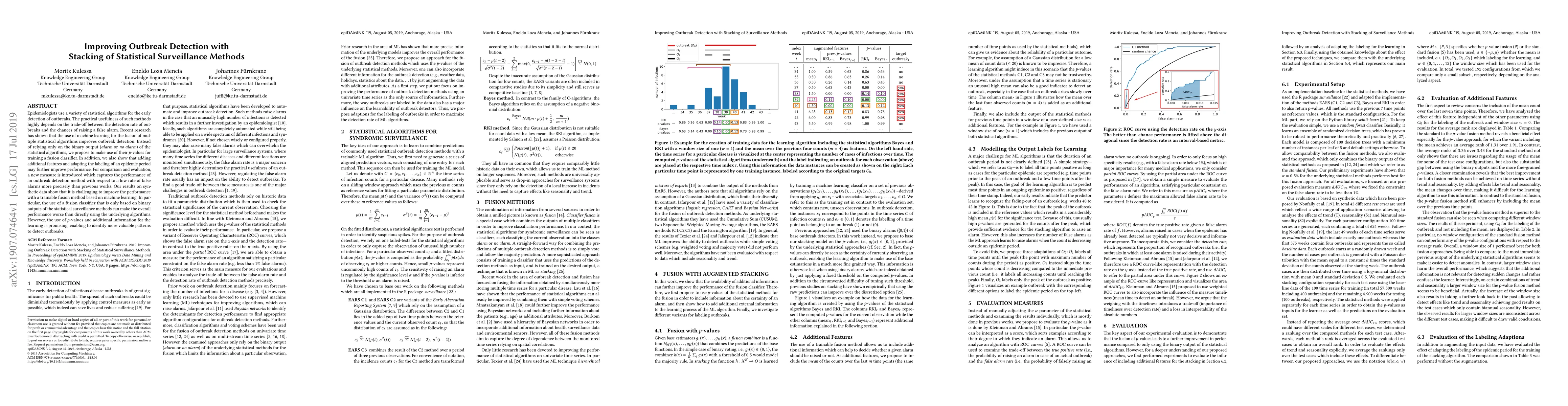 Epidemiologists use a variety of statistical algorithms for the early detection of outbreaks. The practical usefulness of such methods highly depends on the trade-off between the detection rate of outbreaks and the chances of raising a false alarm. Recent research has shown that the use of machine learning for the fusion of multiple statistical algorithms improves outbreak detection. Instead of relying only on the binary output (alarm or no alarm) of the statistical algorithms, we propose to make use of their p-values for training a fusion classifier. In addition, we also show that adding additional features and adapting the labeling of an epidemic period may further improve performance. For comparison and evaluation, a new measure is introduced which captures the performance of an outbreak detection method with respect to a low rate of false alarms more precisely than previous works. Our results on synthetic data show that it is challenging to improve the performance with a trainable fusion method based on machine learning. In particular, the use of a fusion classifier that is only based on binary outputs of the statistical surveillance methods can make the overall performance worse than directly using the underlying algorithms. However, the use of p-values and additional information for the learning is promising, enabling to identify more valuable patterns to detect outbreaks.