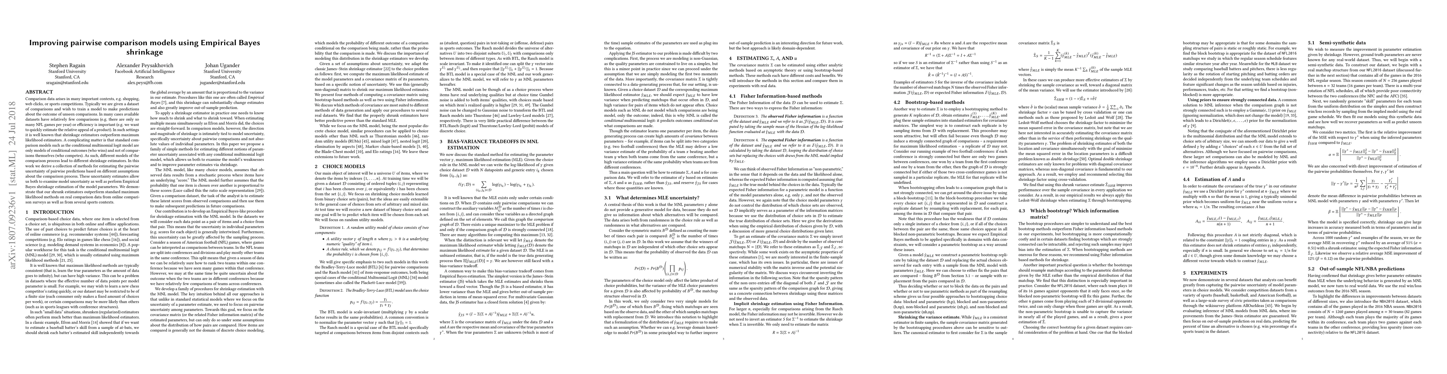 Comparison data arises in many important contexts, e.g. shopping, web clicks, or sports competitions. Typically we are given a dataset of comparisons and wish to train a model to make predictions about the outcome of unseen comparisons. In many cases available datasets have relatively few comparisons (e.g. there are only so many NFL games per year) or efficiency is important (e.g. we want to quickly estimate the relative appeal of a product). In such settings it is well known that shrinkage estimators outperform maximum likelihood estimators. A complicating matter is that standard comparison models such as the conditional multinomial logit model are only models of conditional outcomes (who wins) and not of comparisons themselves (who competes). As such, different models of the comparison process lead to different shrinkage estimators. In this work we derive a collection of methods for estimating the pairwise uncertainty of pairwise predictions based on different assumptions about the comparison process. These uncertainty estimates allow us both to examine model uncertainty as well as perform Empirical Bayes shrinkage estimation of the model parameters. We demonstrate that our shrunk estimators outperform standard maximum likelihood methods on real comparison data from online comparison surveys as well as from several sports contexts.