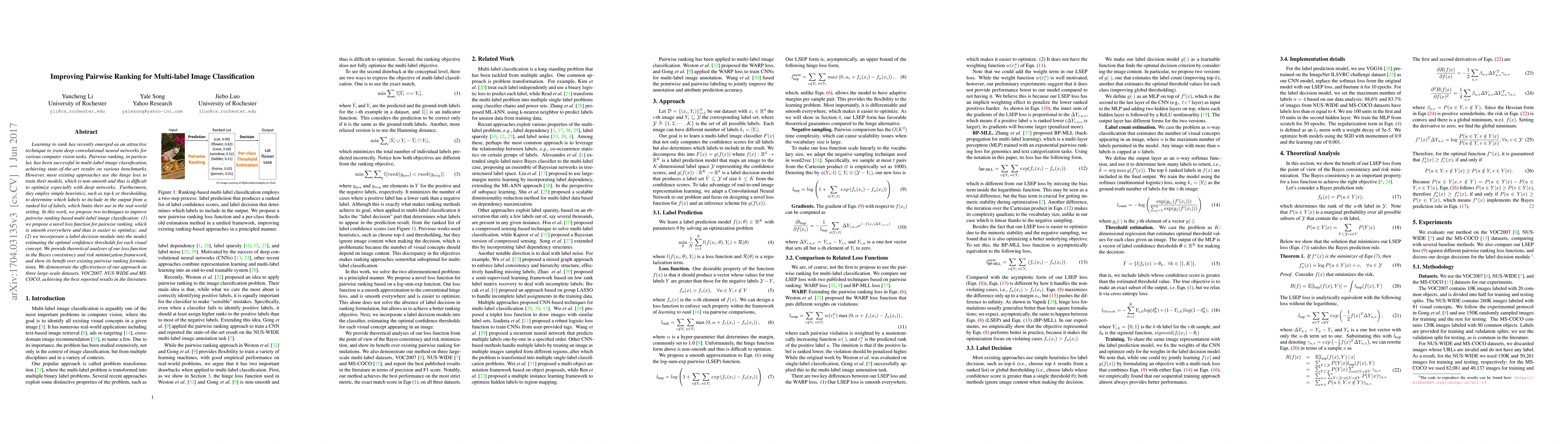 This paper proposes two techniques to enhance pairwise ranking for multi-label image classification: a smooth novel loss function for easier optimization and a label decision module for optimal confidence thresholding. The approach achieves state-of-the-art results on VOC2007, NUS-WIDE, and MS-COCO datasets.