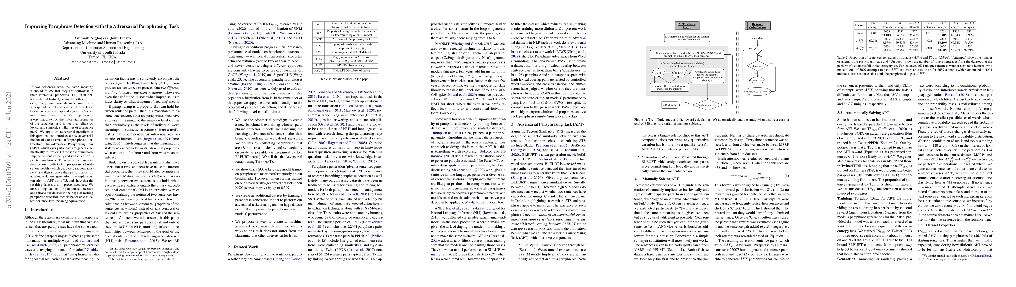 This paper proposes an adversarial method called the Adversarial Paraphrasing Task (APT) to generate semantically equivalent but lexically and syntactically distinct sentence pairs, aiming to improve paraphrase detection models. The authors automate APT using T5 and demonstrate that the resulting dataset enhances model performance.