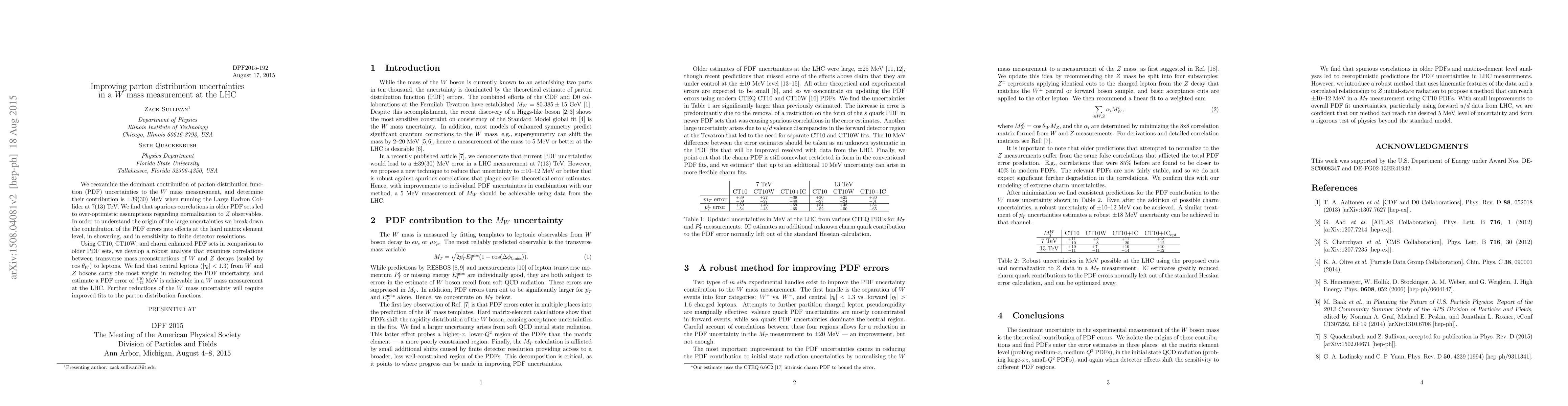 This paper reexamines the parton distribution function uncertainties affecting W mass measurements at the LHC, finding a significant contribution of +-39(30) MeV at 7(13) TeV. It identifies spurious correlations in older PDF sets and suggests central leptons (|$\eta_l$| < 1.3) from W and Z decays can reduce the PDF uncertainty to +10/-12 MeV.