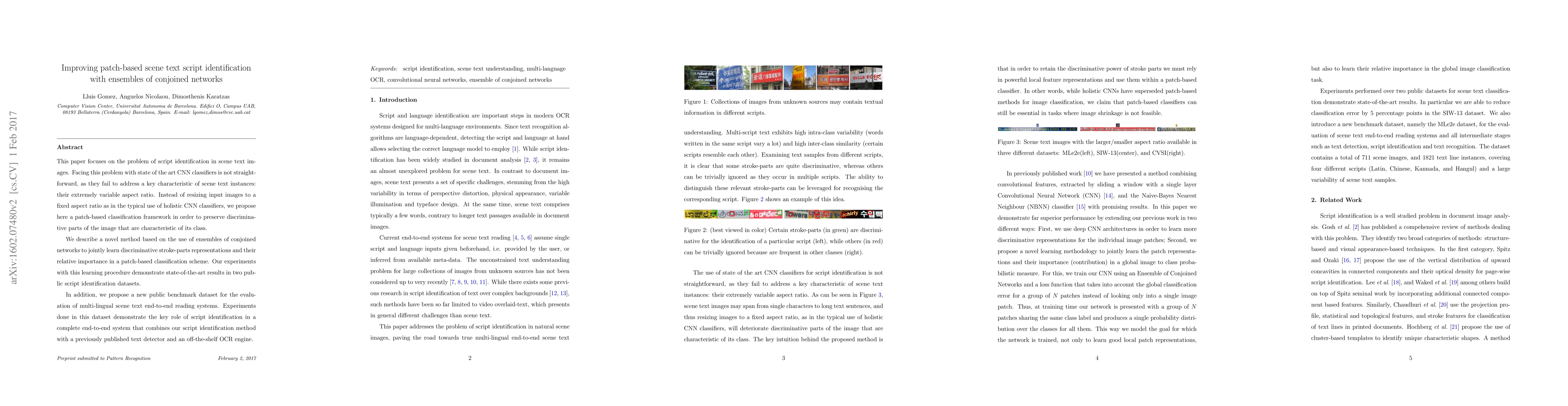 This paper proposes a patch-based classification framework using ensembles of conjoined networks to improve script identification in scene text images, addressing the issue of variable aspect ratios. The method achieves state-of-the-art results on public datasets and introduces a new benchmark for multi-lingual scene text reading systems.