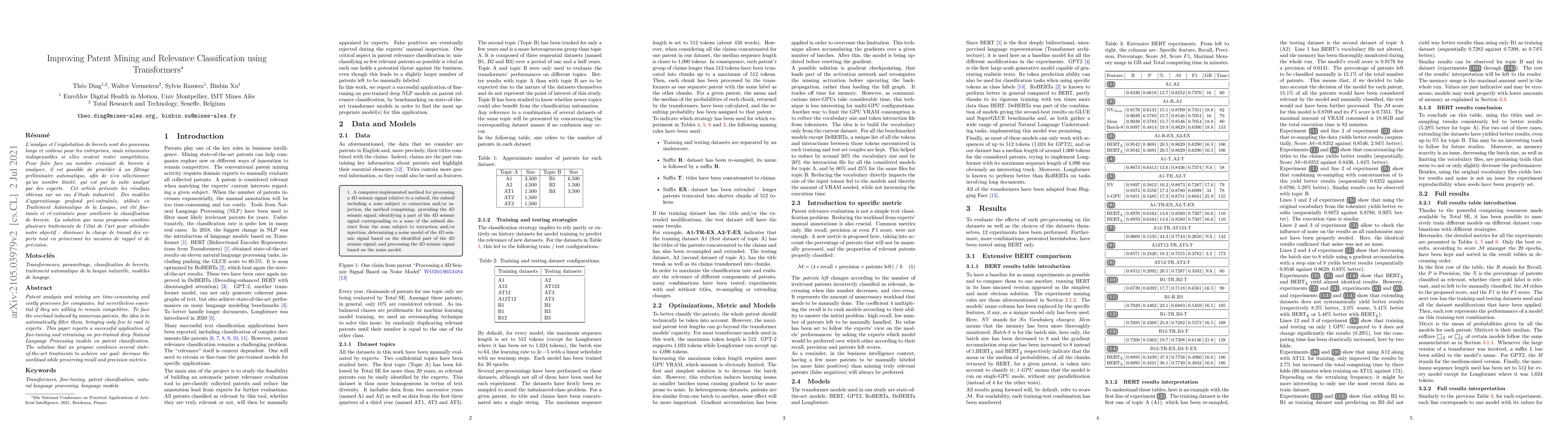 Patent analysis and mining are time-consuming and costly processes for companies, but nevertheless essential if they are willing to remain competitive. To face the overload induced by numerous patents, the idea is to automatically filter them, bringing only few to read to experts. This paper reports a successful application of fine-tuning and retraining on pre-trained deep Natural Language Processing models on patent classification. The solution that we propose combines several state-of-the-art treatments to achieve our goal - decrease the workload while preserving recall and precision metrics.