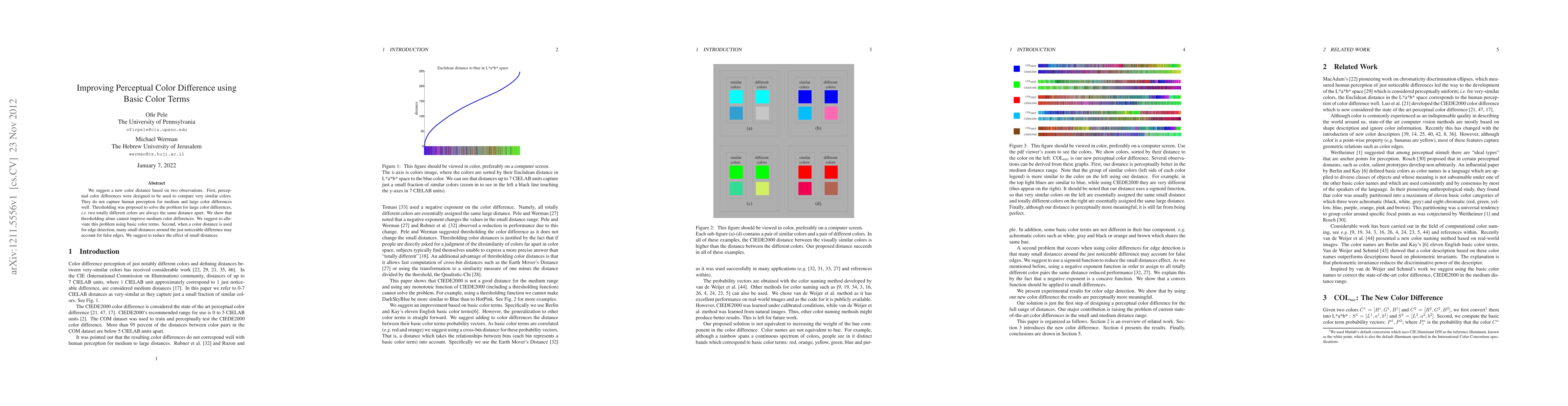 We suggest a new color distance based on two observations. First, perceptual color differences were designed to be used to compare very similar colors. They do not capture human perception for medium and large color differences well. Thresholding was proposed to solve the problem for large color differences, i.e. two totally different colors are always the same distance apart. We show that thresholding alone cannot improve medium color differences. We suggest to alleviate this problem using basic color terms. Second, when a color distance is used for edge detection, many small distances around the just noticeable difference may account for false edges. We suggest to reduce the effect of small distances.